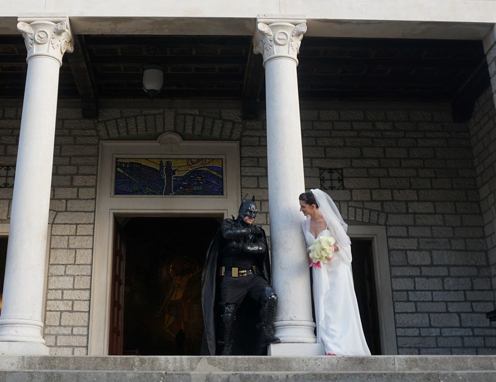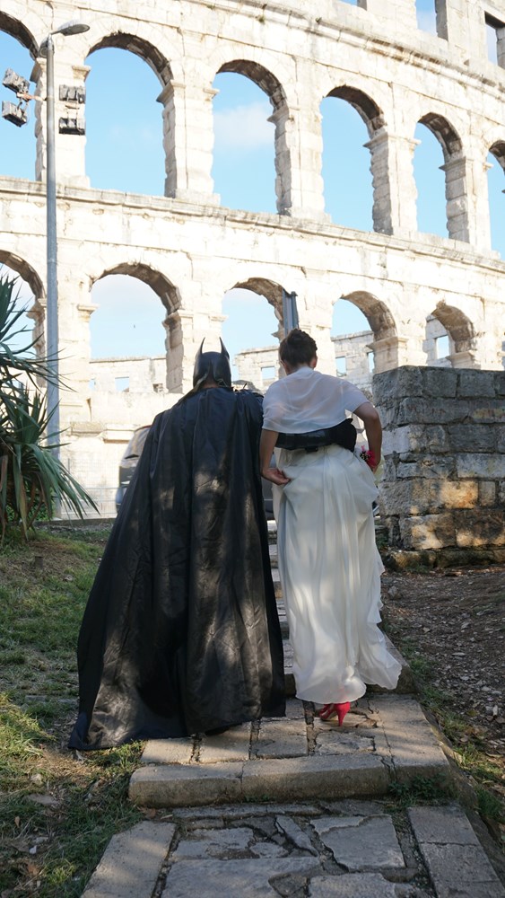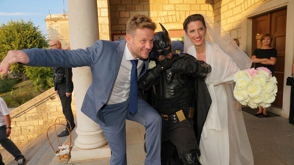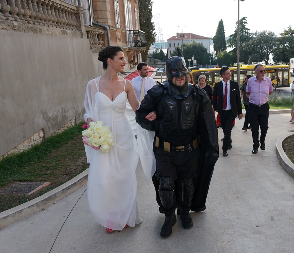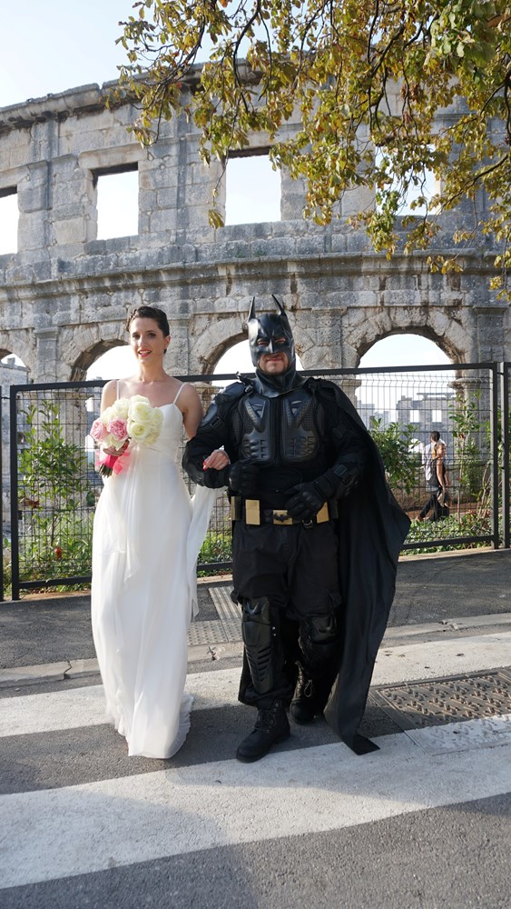 I to ne samo prošetao, već dopratio mladenku do oltara u pulskoj crkvi Sv. Antuna. Je li ispod dobro znanog kostima bio Bruce Wayne - manje je važno, no mladenka zasigurno nije imala problema s obzirom da je ovaj slavni superjunak budno pazio na nju dok se uspinjala Škaljerovom ulicom prema crkvi Sv. Antuna. Kako svadbeni običaji nalažu, tradicionalno su se fotografirali ispred pulske Arene, a nakon toga je Batman prepustio mladenku u sigurne ruke mladoženje.
