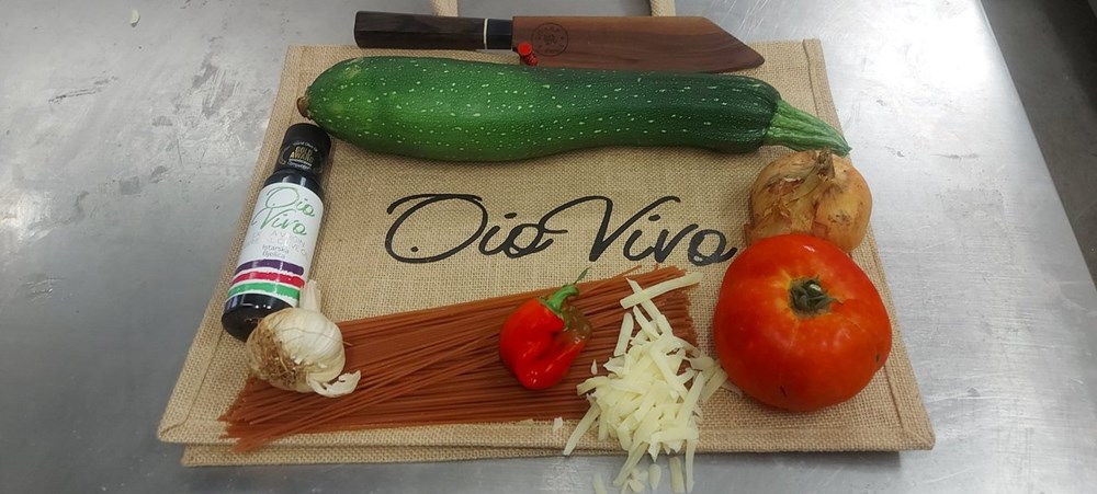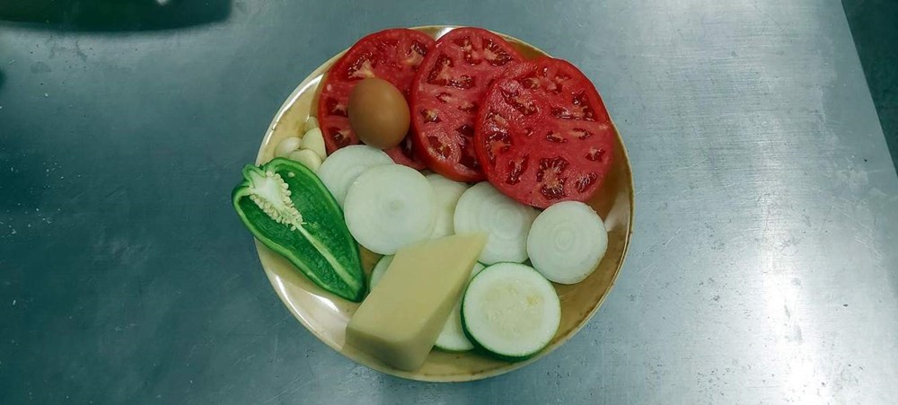 Pomidor narežemo na 4 veće fete, tikvicu narežemo na fete srednje debljine, kapulu marežemo na tanke fete, češnjak usitnimo nožem, naribamo tvrdi kravlji sir na najkrupnije, papriku razrežemo na polovice i ostavimo sjemenke u njoj.