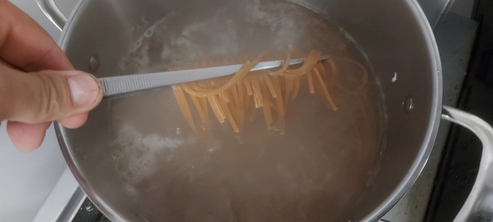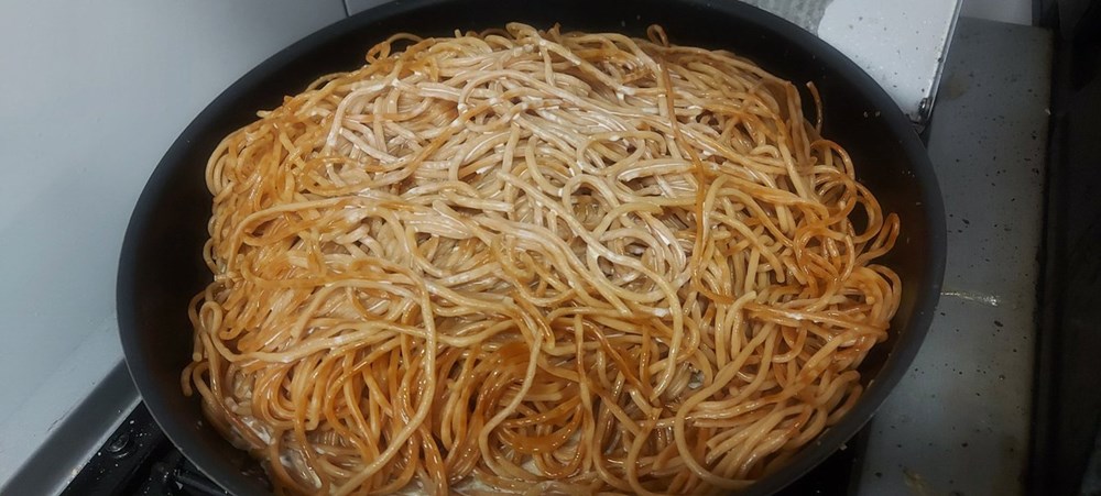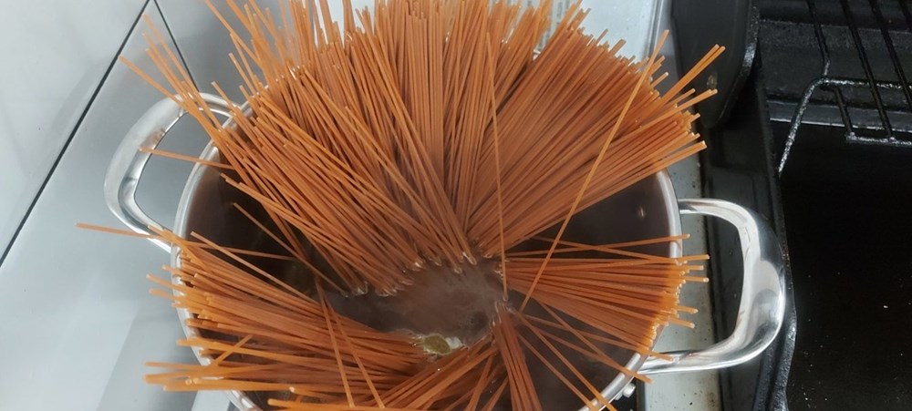 Spagette ste skuhali u kipućoj slanoj vodi paralelno kad ste pekli povrće. Paštu procijedite pa bacite na toplu tavu, dodajte 1,5 dcl vrhnja za kuhanje i pola šake mrvljenog parmezana, sve dobro par minuta na laganoj vatri izmiješajte pa maknite sa izvora topline. Sada je vaše jelo spremno za slaganje... prvo u poluduboki tanjur stavite spagette, pa zatim na spagette stavite fetu pečenog pomidora.