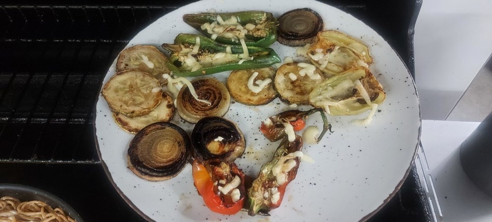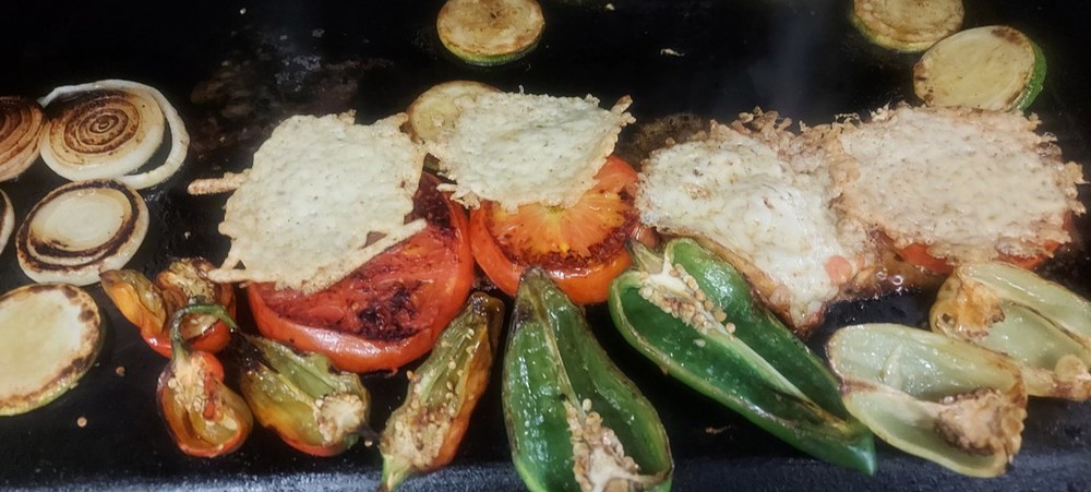 Na roštilj ploči (ili ako ju nemate može i na ravnoj tavi), na maslinovom ulju ispecite i lagano posolite i popaprite s obje strane pomidor, tikvicu i luk, dok s obje strane lagano ne posmeđe.