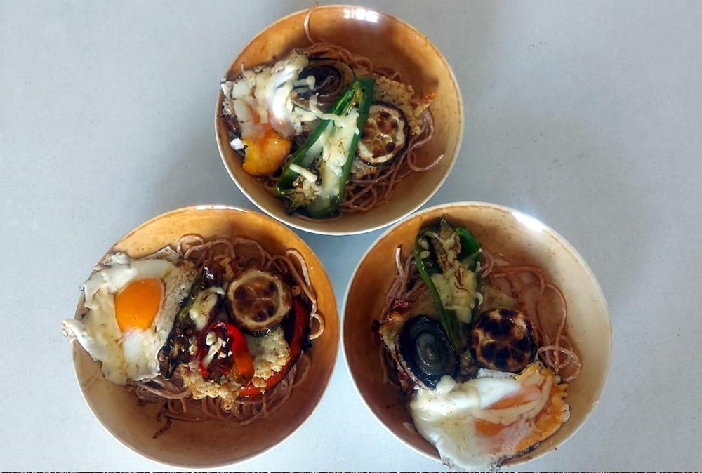 Nakon što se ispeklo povrće na žaru ispeći 4 jaja na oko. Ta jaja na oko kasnije staviti preko ostale hrane.