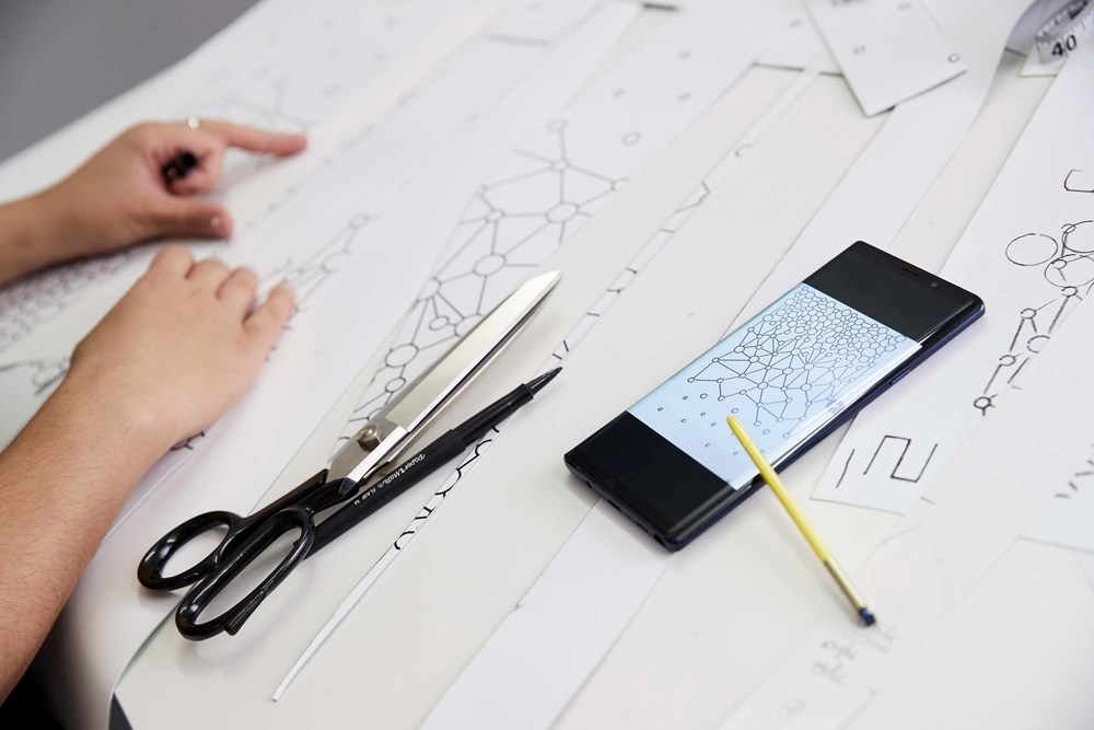 Oblik odjeće, uzorak tkanina i pričvršćivača nacrtani su s pomoću S Pen olovke na velikom 6,4-inčnom zaslonu Note9, najvećem zaslonu koji se ikad pojavio na Note seriji.