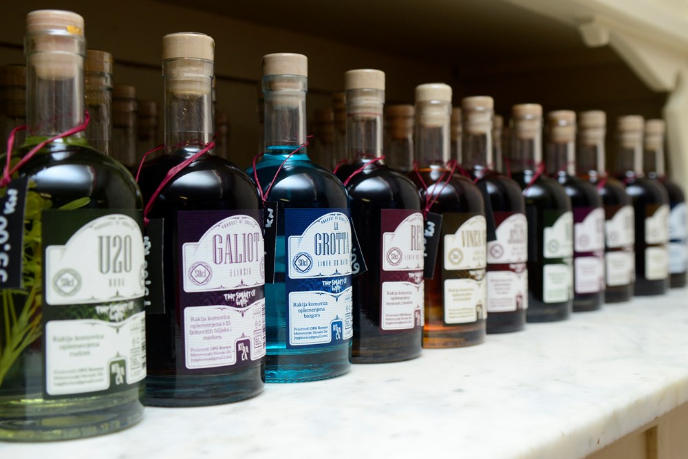 Primjereno, liker od grožđa sorte hrvatica zove se Kraljica Jelena; liker od lješnjaka nosi naziv Quo (naravno, od Quo vadis?), dok se liker od borovnice zove OSB, što je znalcima poznata skraćenica od Ordo Sancti Benedictii, odnosno od benediktinskog redovničkog reda. Priču o lokalnoj biološkoj raznolikosti lijepo zaokružuje liker od masline nazvan Noa, međutim od ove godine paletu proizvoda destilerije Alberta Korace zaokružuje još pet novih proizvoda: liker od bazge La grotta, liker od višnje i malvazije Ros solis, liker od smokve i malvazije Grij, liker od jabuke i malvazije Pyr, te medica s chillijem nazvana Gea. Novi Koracin proizvod je i za naše prilike pomalo neobična žestica nazvana Stara svraka, a riječ je o proizvodu kojeg u različitim zemljama zovu ječmeno vino ili liker od piva, ili opisno najpreciznije pjenušac od piva i vina s dodatkom viskija.