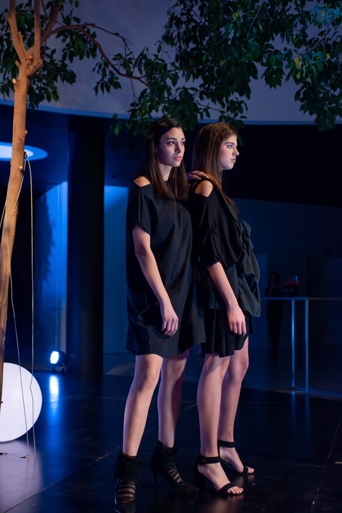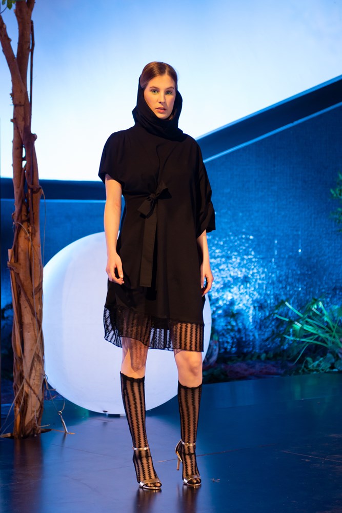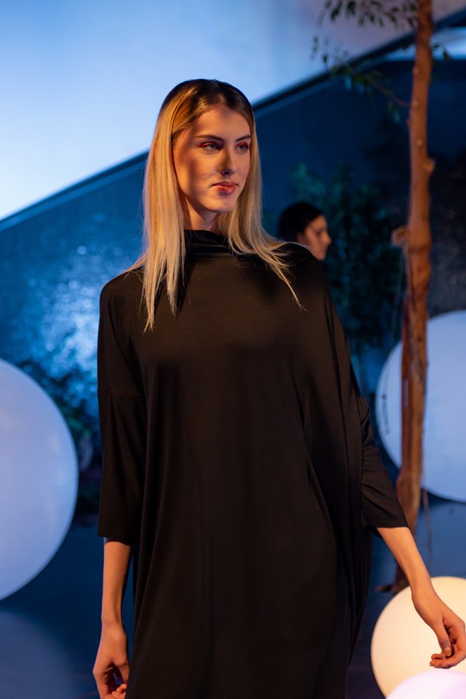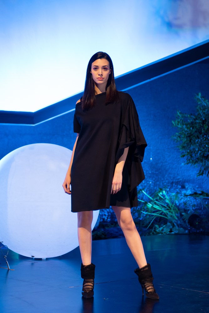 Spajanjem različitih tekstura materijala, drapiranjem i već prepoznatljivim načinom konstrukcije, Martina Herak je i ovom kolekcijom ostala dosljedna svom načinu stvaranja i stilu, koje nikako ne možemo poistovjetiti s onim konvencionalnim. Haljina crne boje je tipično djelo poznate modne dizajnerice gdje imamo maštovito igranje s naborima te naglašava komociju otmjenosti.