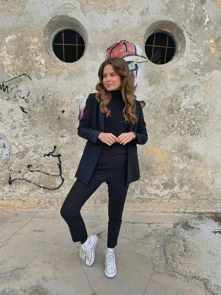 Kombinacija sa stavom: crno je uvijek dobra ideja, a bijele tenisice "classic outfit" pretvaraju u casual i udoban look