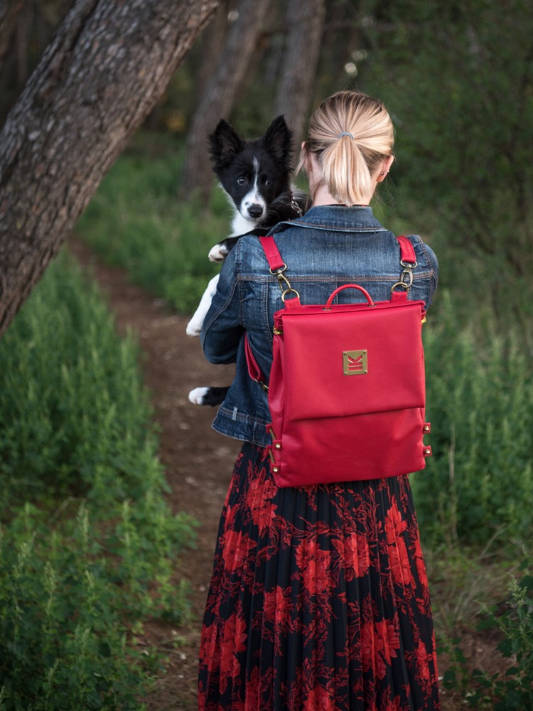 Crvena prevladava I u četvrtom prijedlogu. Crvena IK torba s mesinganim detaljima nosiva je na više načina, a za šetnju sa psom idealno ju je nositi kao ruksak. Ovdje sam ju spojila s jeans jaknom i plisiranom haljinom na crvene cvjetove.