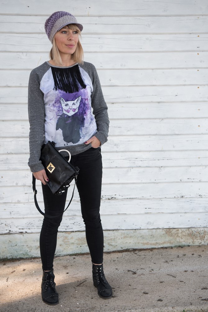 Crne traperice, majica originalnog dizajna ZIB textile, heklana kapa sa šiltom u ljubičastim nijansama i mala crna IK torbica - šesti je prijedlog.