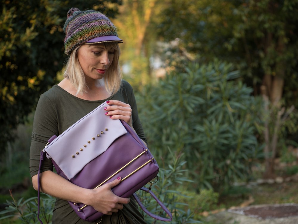 Posljednja kombinacija - jednobojna maslinasta haljina, upotpunjena je pletenom kapom u nijansama od maslinasto zelene do ljubičaste boje u kojoj je i šilt, a dolazi u paru s IK torbom od istog materijala.