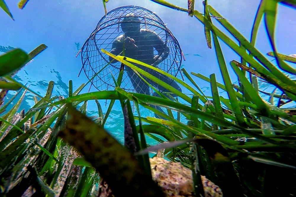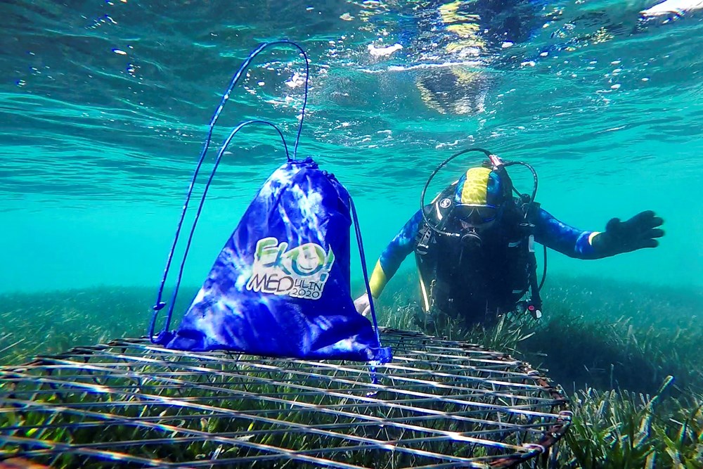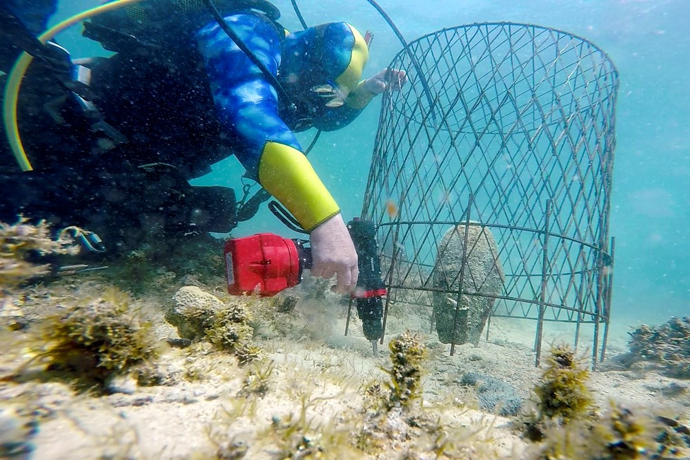 Da bi se izbjeglo postavljanje betonskih blokova, za pričvršćivanje kaveza korištena je ekološki prihvatljivija tehnika bušenja podloge podvodnom električnom bušilicom i postavljanja vijaka.