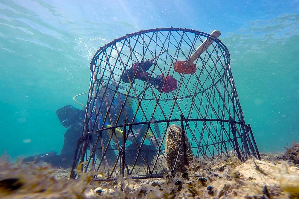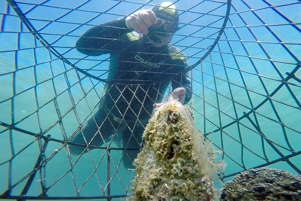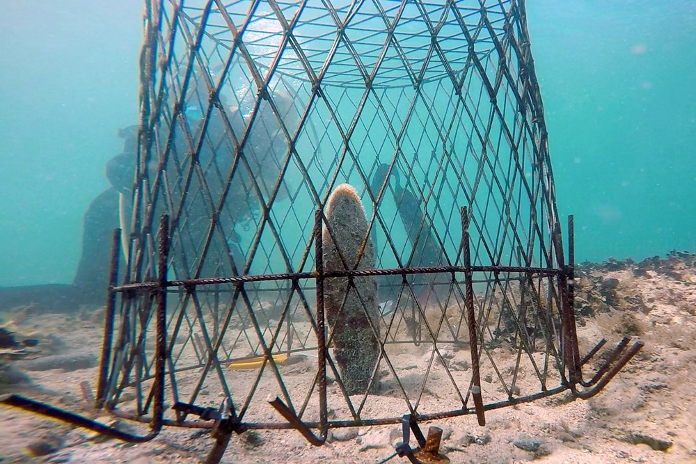 Metalni kavezi su postavljeni da bi preživjele primjerke zaštitili od potencijalnih predatora, među kojima je na žalost i Homo sapiens. Otvori na njima su dovoljno mali da zaustave orade, hobotnice i kvrgave zvjezdače, a dovoljno veliki da omoguće strujanje mora s fitoplanktonom i zooplanktonom kojima se periske hrane filtrirajući vodu.