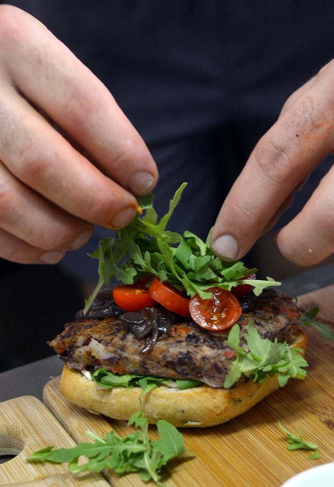 Istina je da su posljednje vrijeme burgeri kod nas postali hit, ali nitko ih, barem koliko znamo, ne priprema na način na koji to čine Manuel i Mario. Uvjerili smo se u to već pri kušanju prvog burgera, vegetarijanskog. Lagano bučino pecivo pod kojim se krije po svemu posebna pljeskavica. Nju se dobiva pasiranjem kuhanog crnog graha, koji je zapravo osnova, paprike, luka, u smjesu se zatim dodaju maslinovo ulje, jaje i krušne mrvice da bi se sve povezalo. Uz povrtnu pljeskavicu ide umak aioli od češnjaka te rukola i cherry rajčice. Iako bi grah i krušne mrvice mogle sugerirati da je pljeskavica suha, u ovom slučaju nije tako, naprotiv, vegetarijanski burger je sočan i, začudo za nas mesoljupce, vrlo ukusan.
