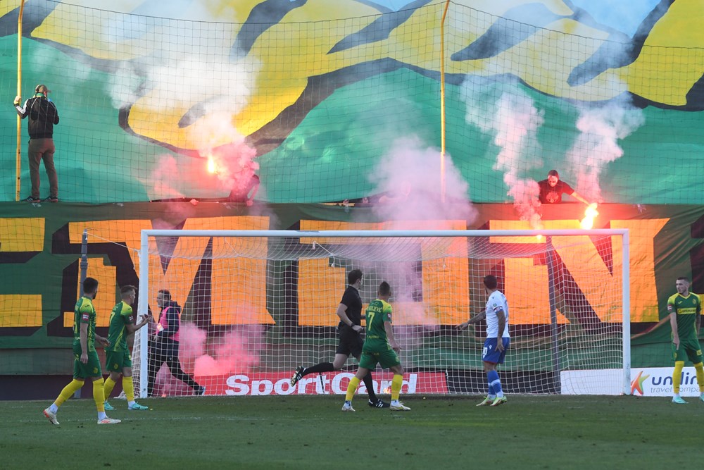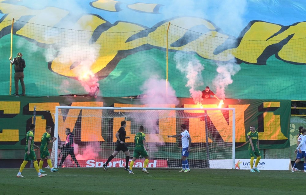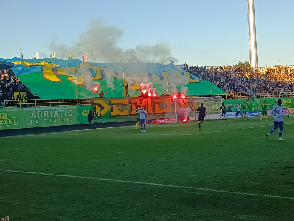 72' Krenula je bakljada s južne tribine, stvorila se prava dimna zavjesa u domaćem kaznenom prostoru i sudac Čulina je nakratko prekinuo utakmicu
