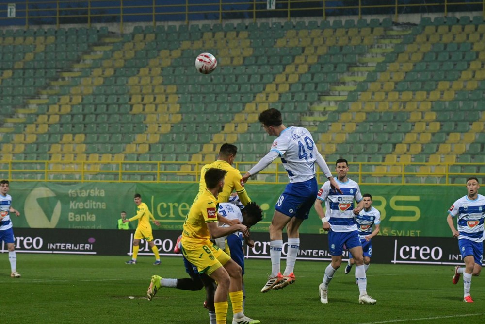 Pulska je momčad bila puno bolja u prvih 45 minuta, teško je sjetiti se kad su Zeleno-žuti imali toliki broj kornera u cijeloj utakmici, kamo li u poluvremenu. Nažalost, od svih tih ubačaja iz kuta spomena vrijedna su samo dva. U prvoj se situaciji stvorila velika gužva pred golom Malenice, pucali su prvo Frederiksen, pa Prevljak petom, ali lopta se uvijek odbijala od nekog od osječkih braniča.