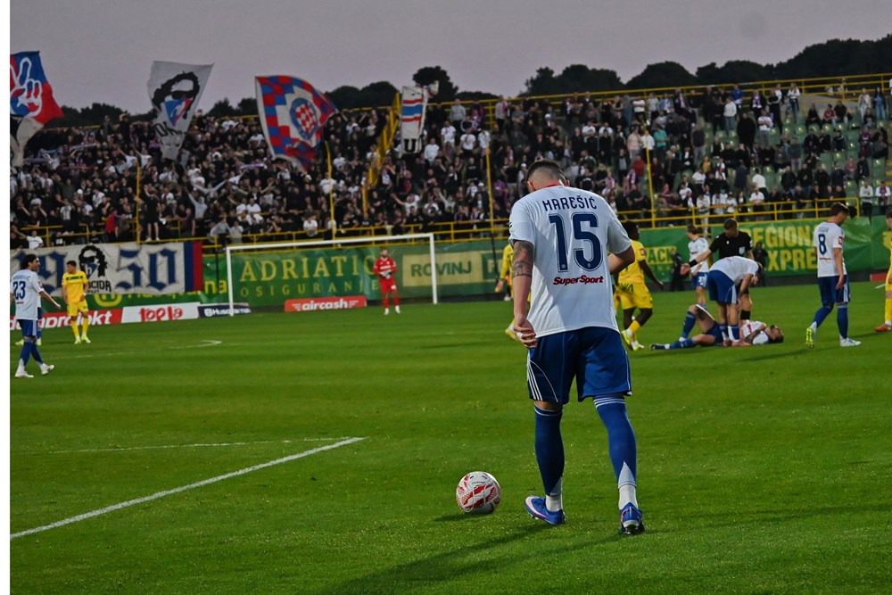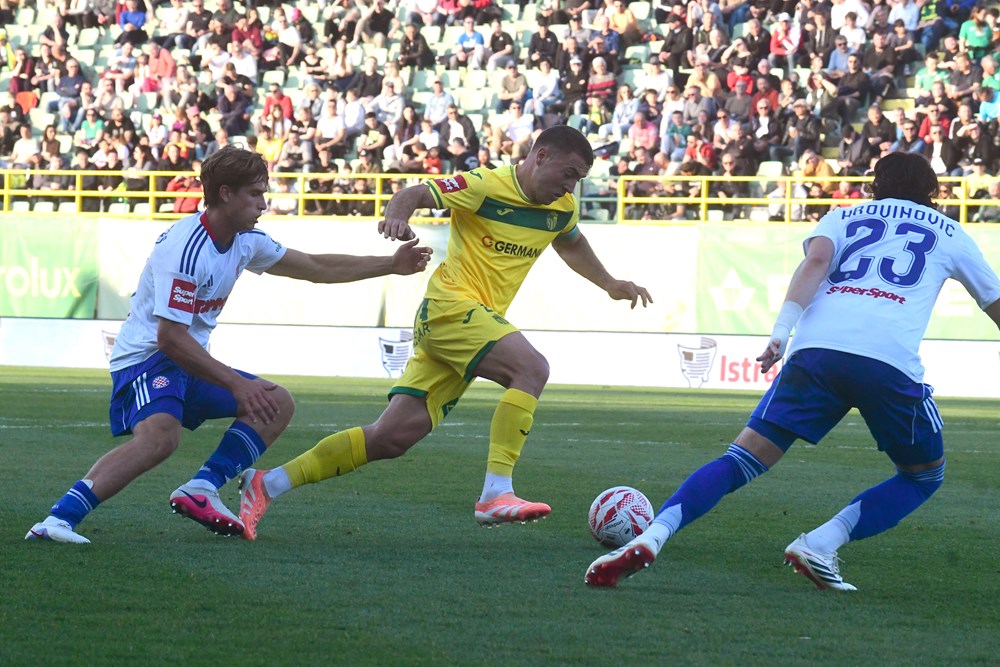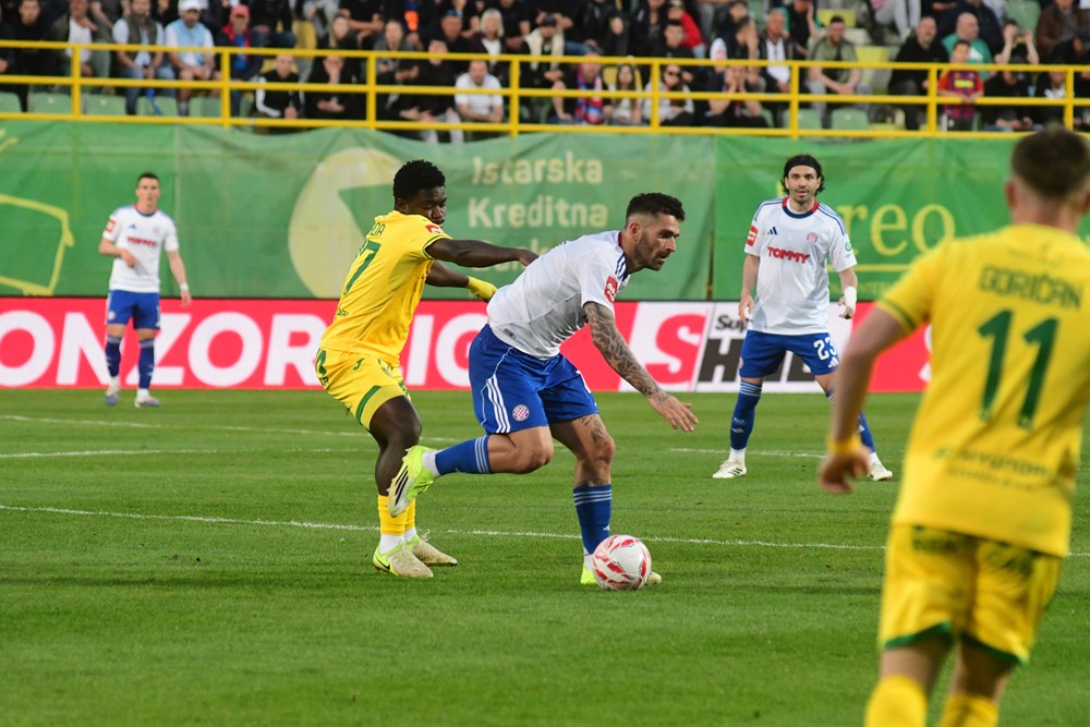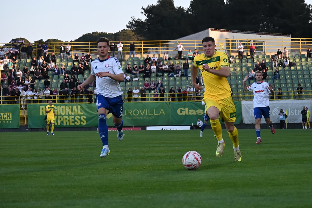 Kraj prvog poluvremena. Hajduk zasluženo vodi 1:0 golom Livaje. Splićani su dva puta, preko Pukštasa i Livaje, pogodili okvir gola, a Kolić je skinuo u zicer Pukštasu. Pulski sastav je u prvih 45 minuta bio potpuno izvan utakmice. Vratar Silić ostao je bez posla. Gosti su bili brži i jači u svakom duelu, uz očekivanu dominaciju u posjedu lopte. To svakako nije način na koji se Zeleno-žuti mogu nositi sa Splićanima. Morat će Zeleno-žuti znatno podići svoju igru u nastavku ukoliko misle izbjeći poraz