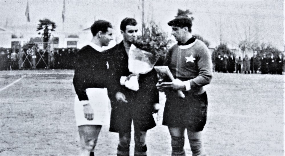 Kapetan pulske ekipe Curto (lijevo) i ekipe Orijenta Brozičević (desno) sa tršćanskim sucem Venuttijem, prije početka utakmice Grion - Orijent, 26. studenog 1939. na Gradskom stadionu u Puli