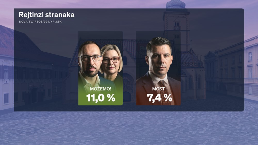 Slijede Možemo s 11 posto te Most s 7,4 posto, koji već treći mjesec zaredom raste. Domovinski pokret ima 2,4 posto, dok Hrvatska stranka umirovljenika, Hrvatski suverenisti i Drito drže po 2,1 posto. Sve ostale stranke su ispod dva posto.