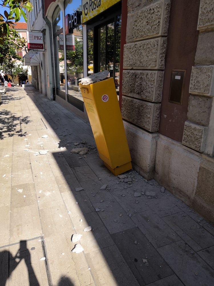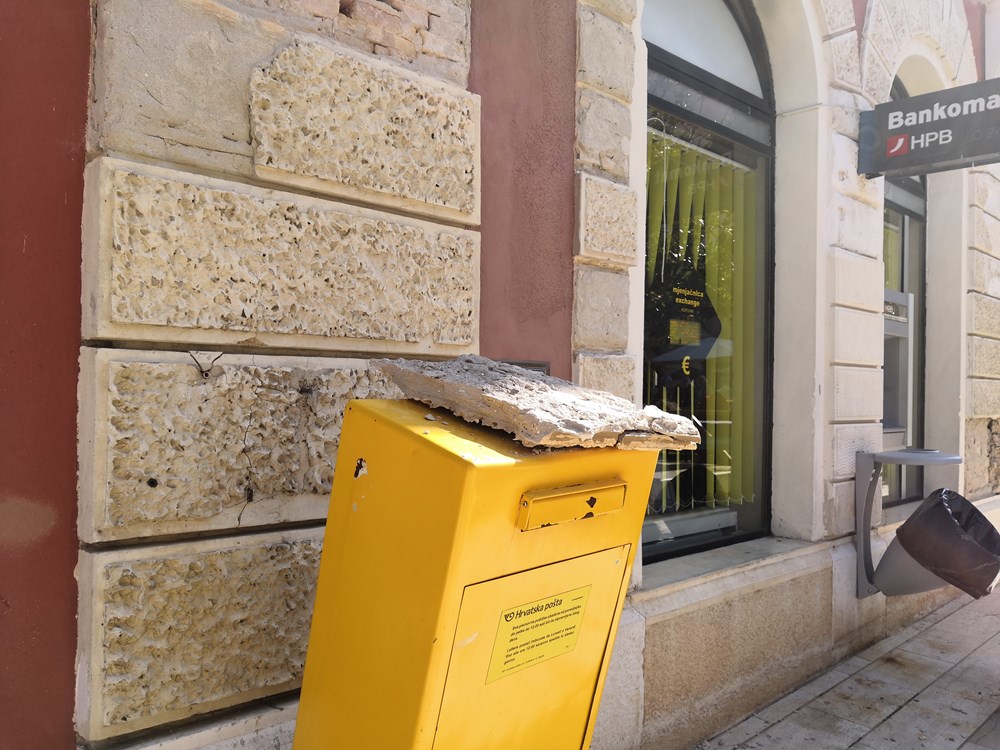 Dobro je da nikome ništa nije palo na glavu, budući se baš na tom mjestu ulazi u poštu. Vlasnici zgrade očito moraju razmisliti o njenoj obnovi. (Napisala i snimila T. KOCIJANČIĆ)