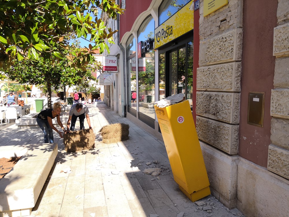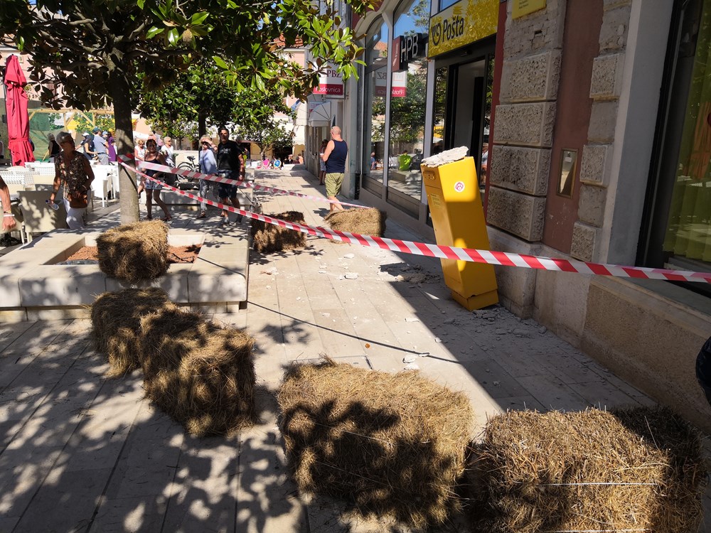 Organizatori su se brzo snašli. Nazvali su komunalne redare i pronašli komade sijena i traku kojima su ogradili taj prostor. Naime, kako je velika gužva u tom dijelu Poreča zbog Giostre, ali i jake vibracije zbog bubnjeva, postoji bojazan da se fasada ponovno uruši.