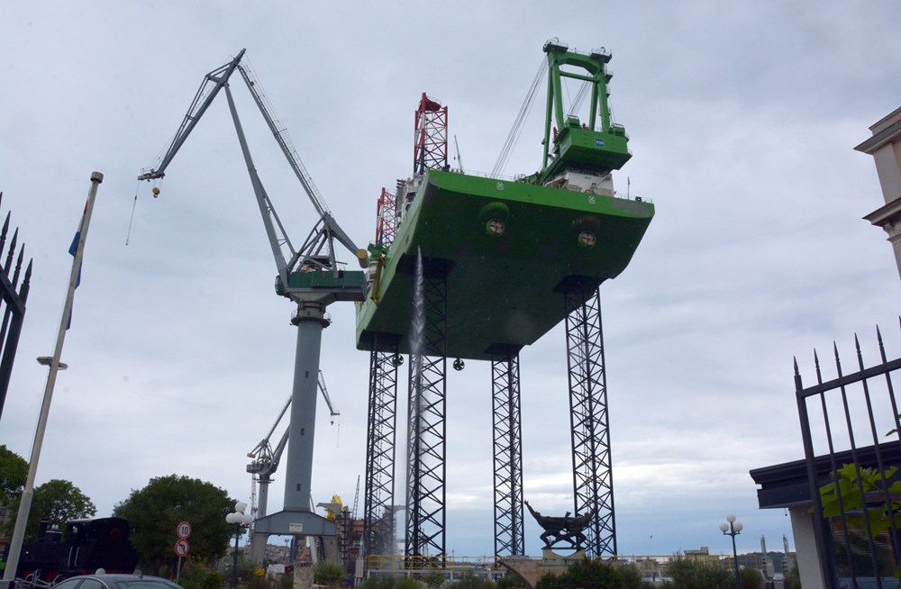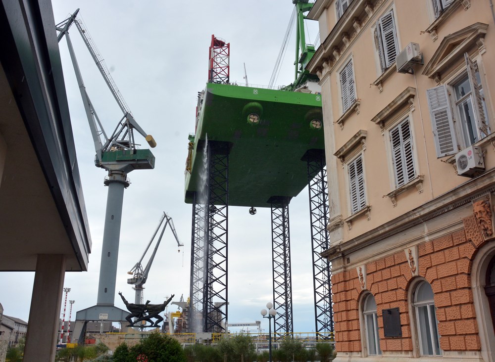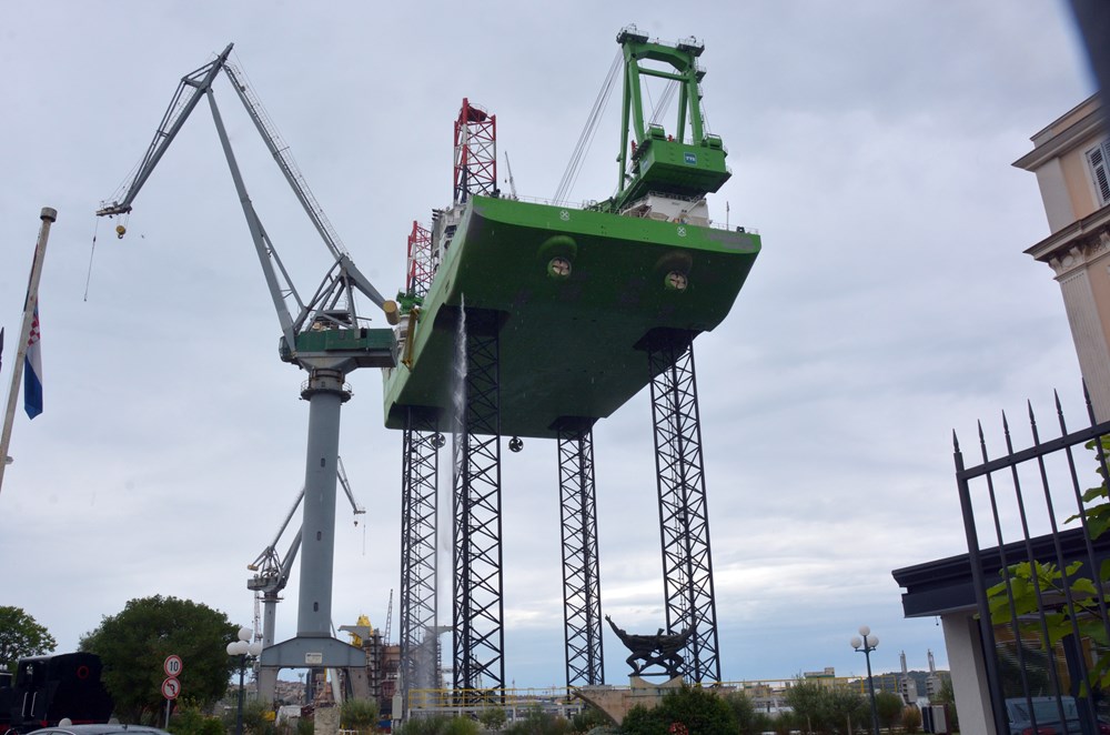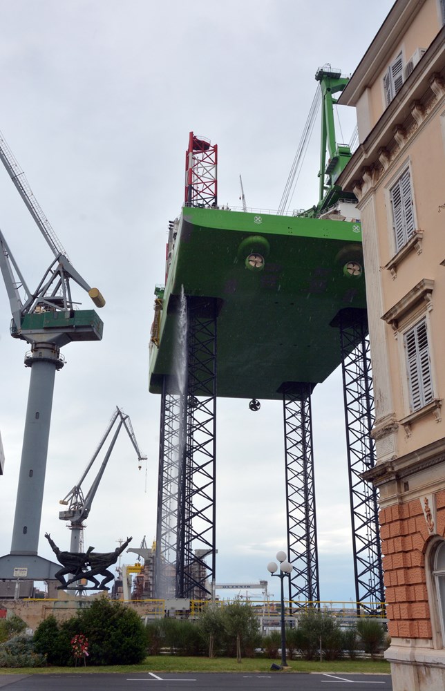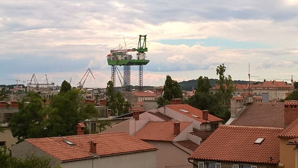 Za scenu nalik onoj viđenoj u SF filmovima zaslužno je jedno u nizu najzahtjevnijih testiranja sustava za podizanje i stabilnosti trupa teškog preko 10 tisuća tona na visini od 80 do 90 metara koje se obavlja nakon povratka s probne plovidbe i ispitivanja maritimnih sposobnosti broda platforme kojeg Uljanik gradi za kompaniju DEME.