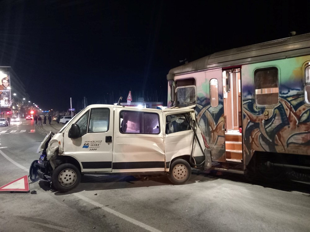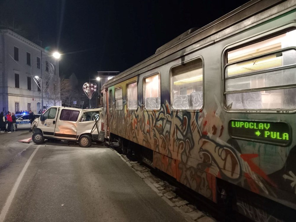 Nevjerojatna prometna nesreća dogodila se u subotu oko 23 sata na pulskoj Rivi. Došlo je do naleta vlaka na kombi vozilo. Putnički vlak koji prometuje od Lupoglava do Pule, nije se zaustavio na kolodvoru u Puli, već je produžio dalje tračnicama koje inače nisu u upotrebi. Kod veslačkog kluba pokupio je parkirani klupski kombi i gurao ga sve do zgrade Lučke kapetanije, što je udaljenost od nekoliko stotina metara.