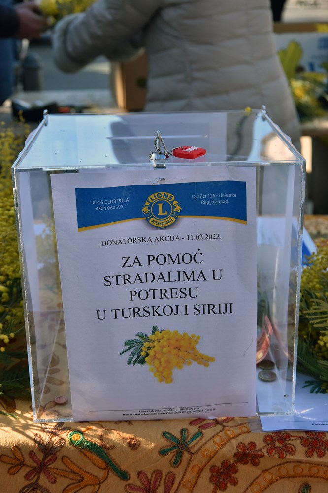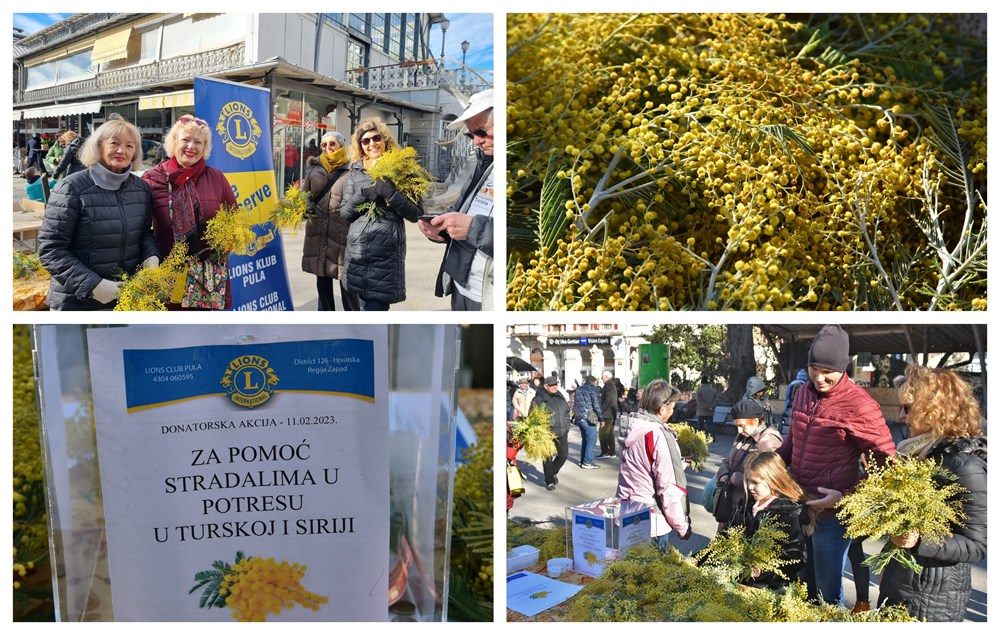 U sklopu tradicionalne donatorske akcije, jutros su na pulskoj tržnici članovi Lions Club Pula sugrađanima nudili buketiće mirisnih mimoza po simboličnim cijenama. Ovogodišnjom akcijom „Za pomoć stradalima u potresu u Turskoj i Siriji", kao što i sam naziv kaže, sredstva su se prikupljala za stradale u potresu koji je u ponedjeljak pogodio jugoistok Turske i sjever Sirije i uzrokovao smrt nekoliko tisuća ljudi, kao i ogromne materijalne štete.