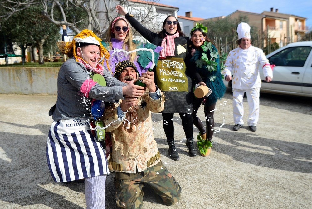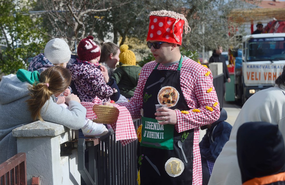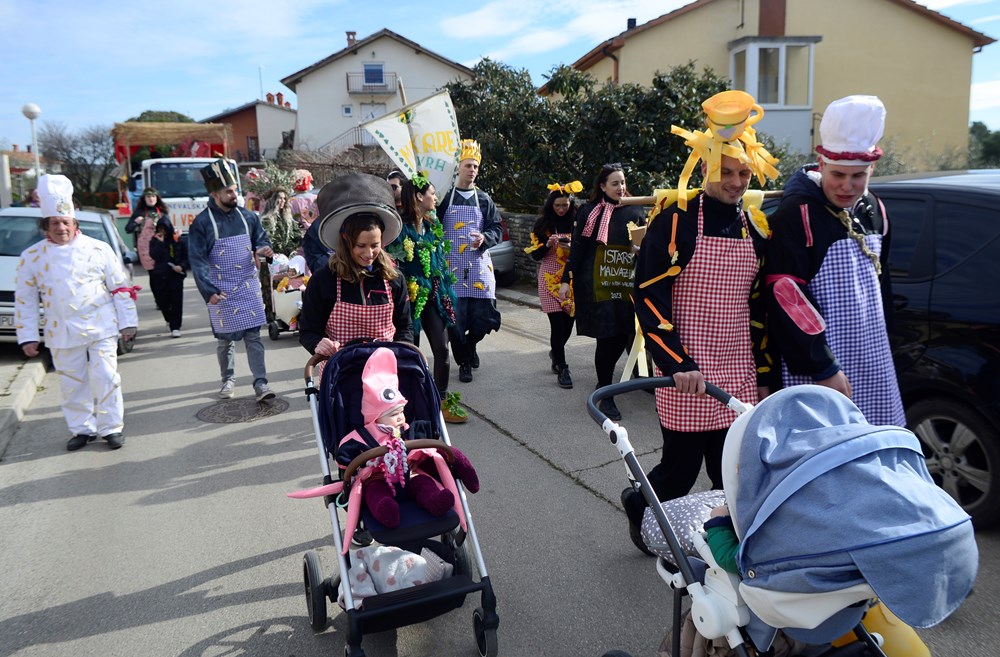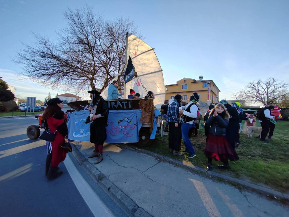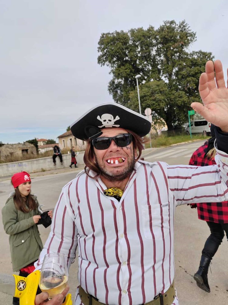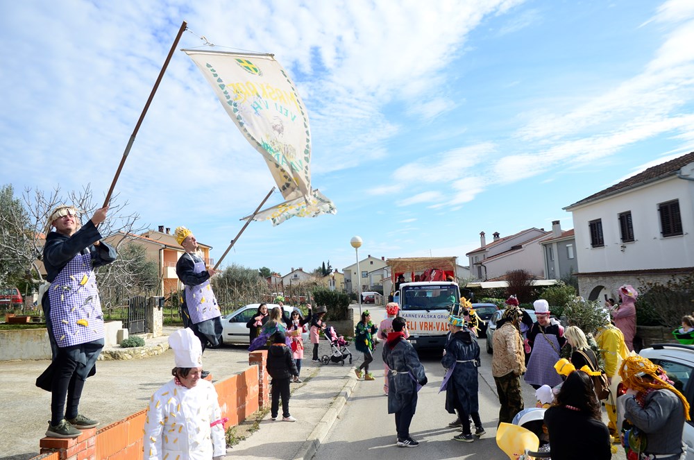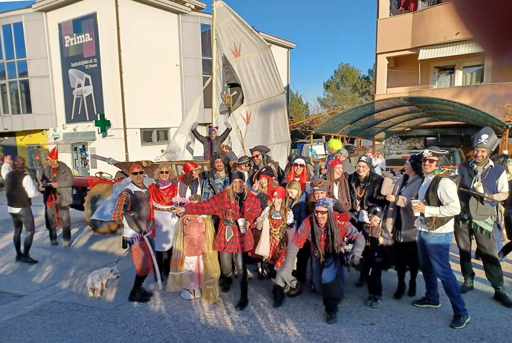 Maškarana grupa Veli Vrh na čelu sa začetnikom Frankom Fornažarom, a koju je ovog puta činilo 40-ak strašnih gusara, proslavila je 20. godišnjicu otkako su prvi put krenuli u veselu povorku po naseljima Velog Vrha. Pod velikim bijelim jedrom, i ovog su puta, kao i prije 20 godina, maskirani gusari i njihovi klinci obišli Veli Vrh i pjesmom i plesom uveseljavali mještane.- Super je atmosfera, napravili smo đir po Partizanskom putu, išli smo do naselja Kapeleri, pa na benzinsku pumpu, i onda u Gardelin na besplatnu maneštru za maškare, rekao nam je David Damijanić, jedan od maskiranih gusara.
