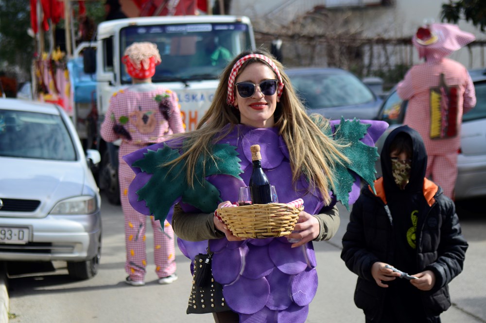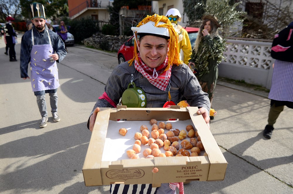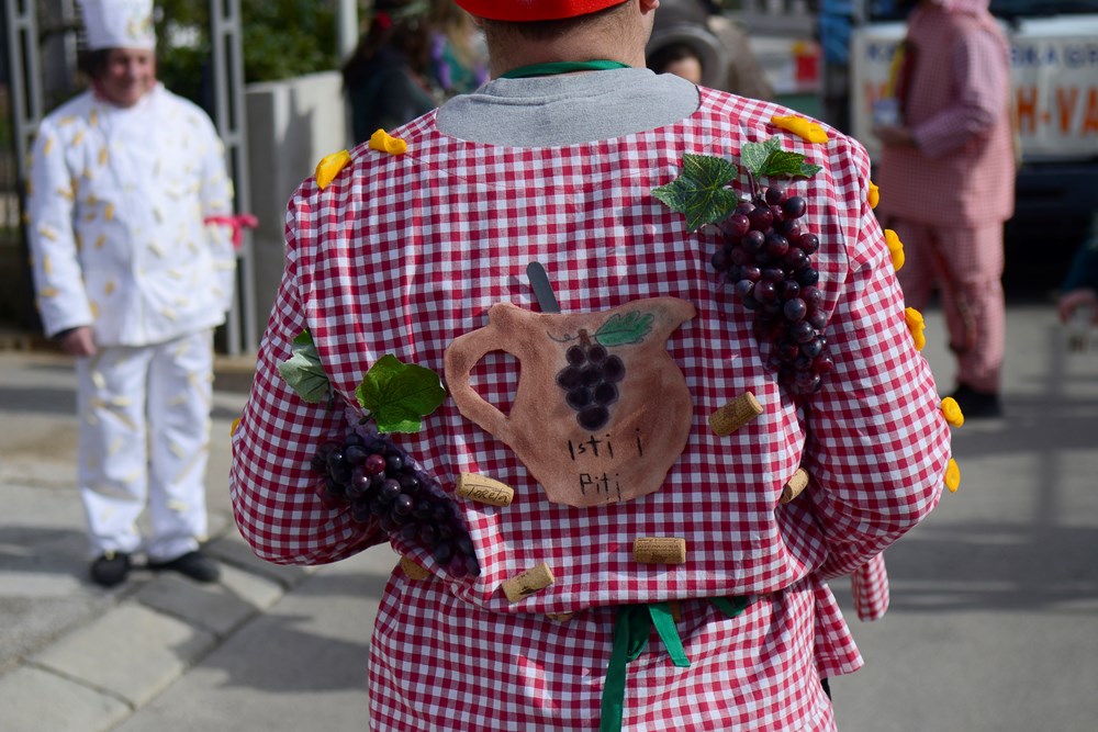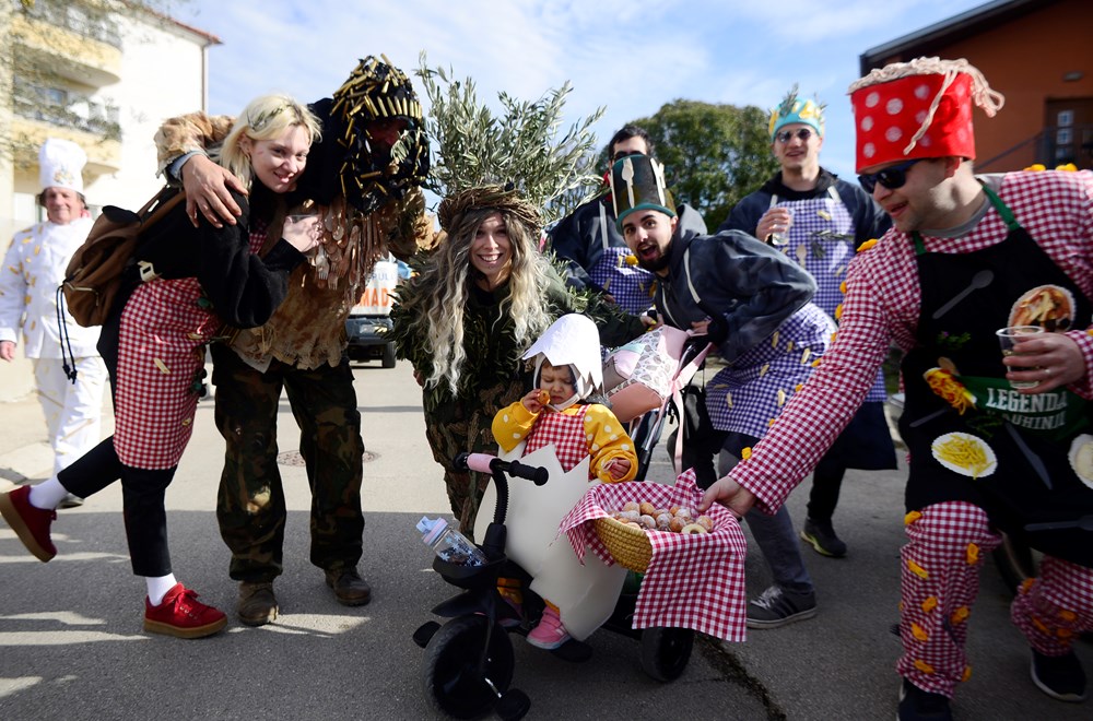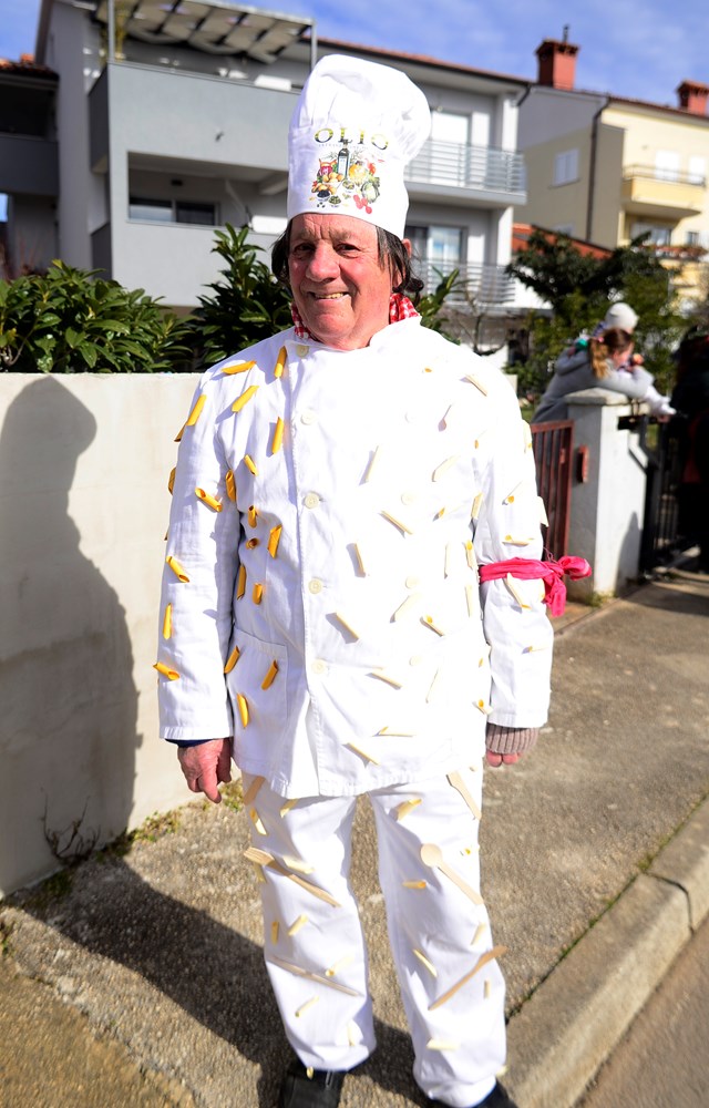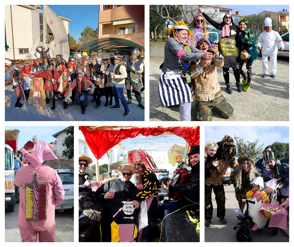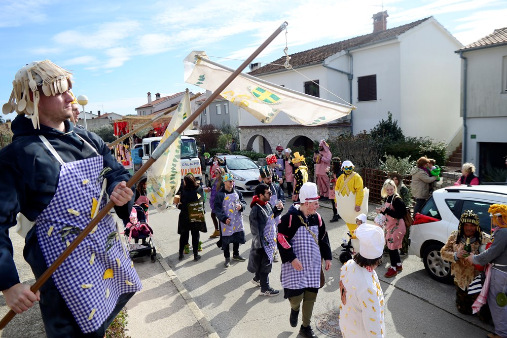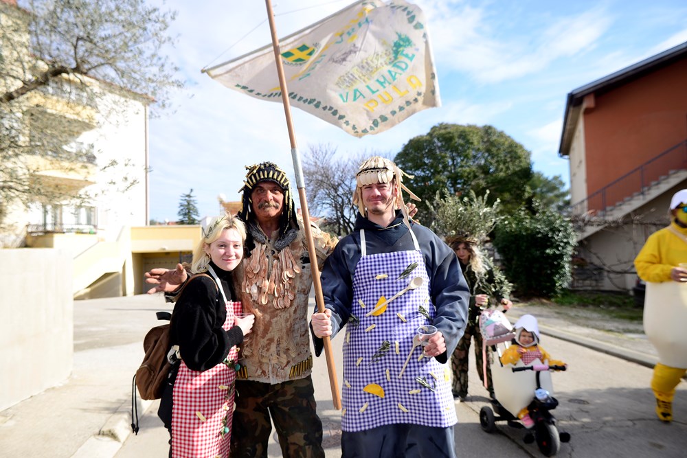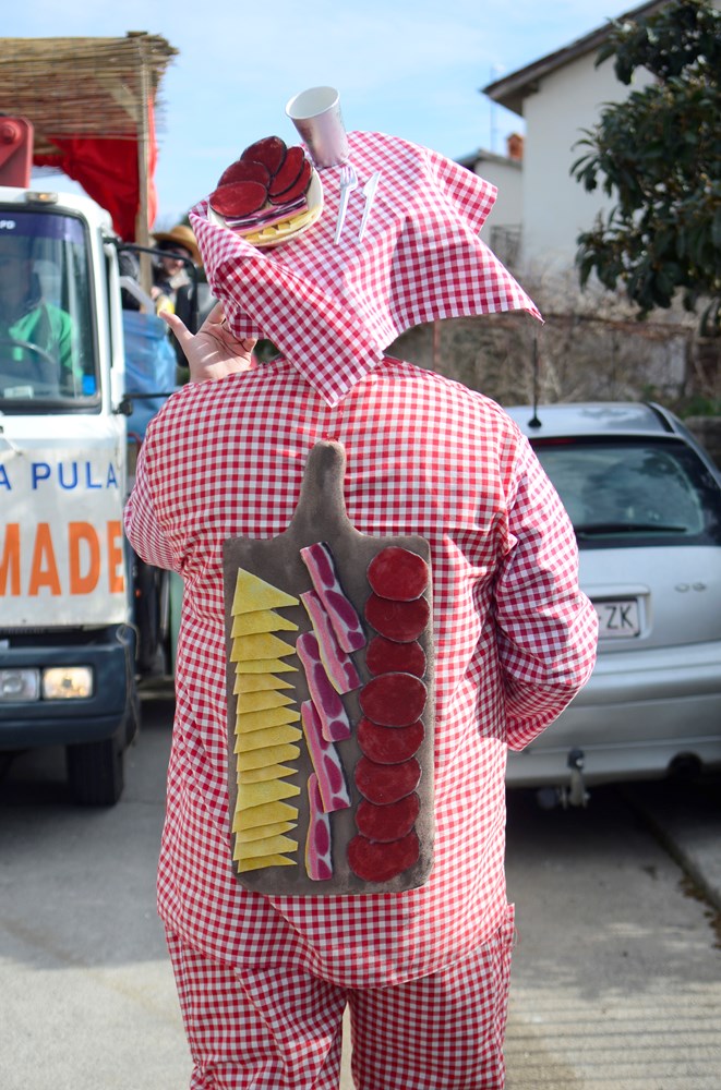 Ti su se Montegrandini ovog puta maskirali u simbole istarske kužine. Fuži, njoki, grožđe, kroštule, bukaleta - svi ovi detalji istarske tradicionalne kuhinje mogli su se vidjeti u ovoj maškaranoj povorci koja je na svom prepoznatljivom kamionu obilazila naselja. Iako zbog zdravstvenih problema meštar pulskog karnevala Damir Pletikos Koroman ovog puta nije bio na čelu karnevalske povorke, dočekao je i ugostio vesele maškare pred svojim kućnim pragom.