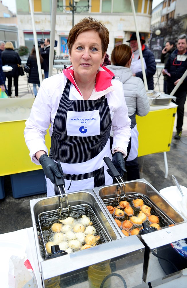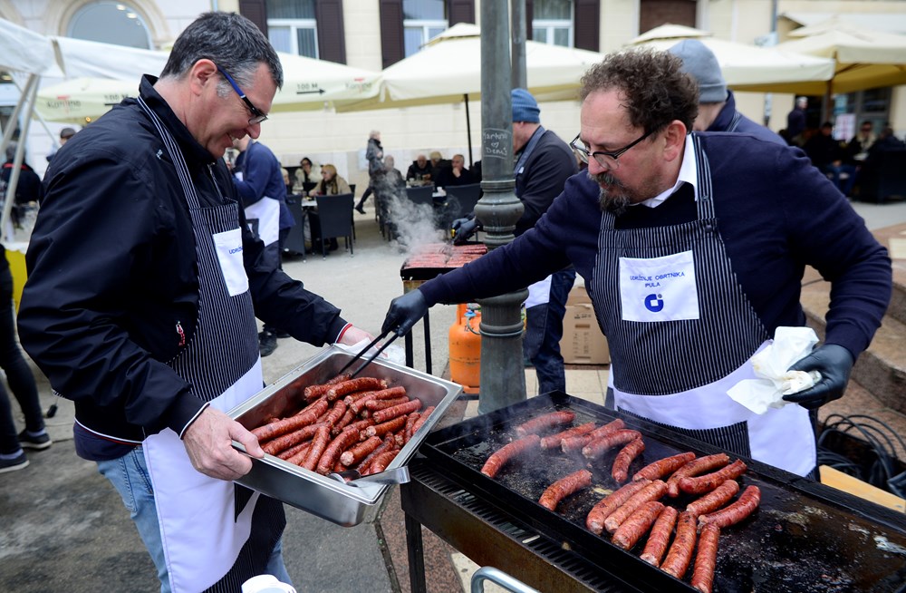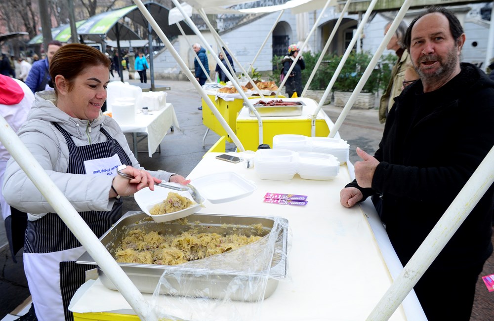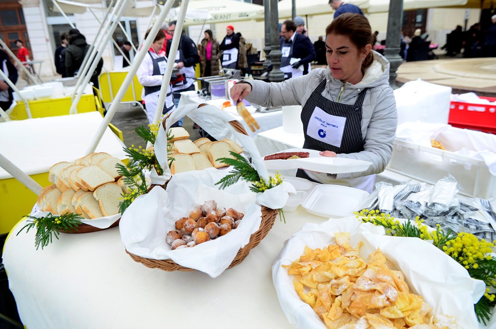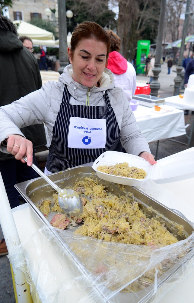 - Radimo pusni tradicionalni jelovnik, a to su kobasice i kapuz, a uz to imamo kroštule i fritule. Podijelit ćemo, nadam se, oko tristo porcija, a ako ne otiđe sve, ćemo morati sami pojesti jer sutra se ne jede zbog korizme. Čitava porcija, koja je dosta obilna za najesti se, a uz to osladiti se s fritulama i kroštulama, košta pet eura, rekao je Zlatko Deskar, predstavnik Udruženja obrtnika Pula.