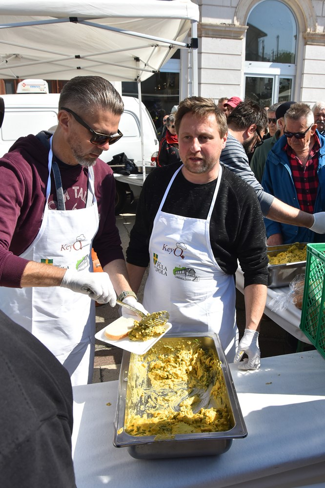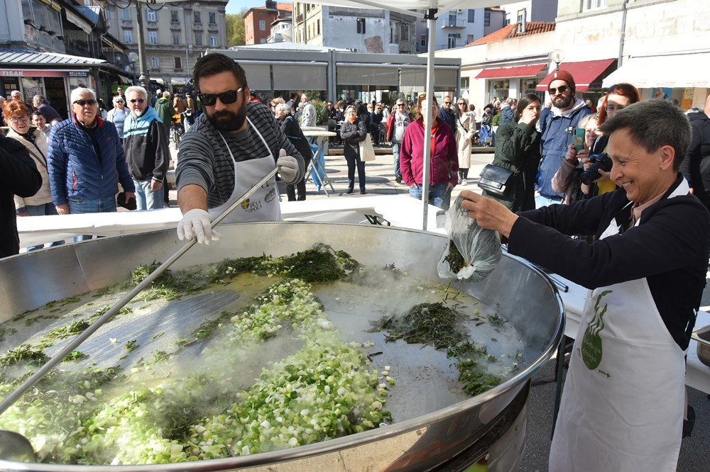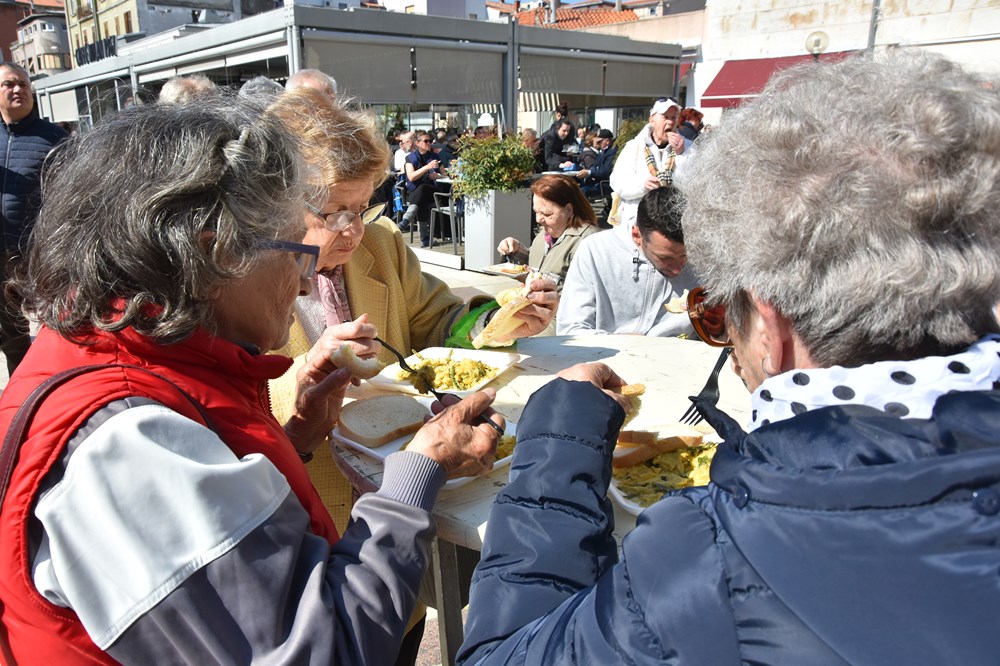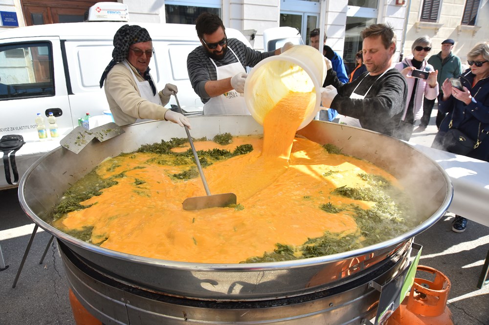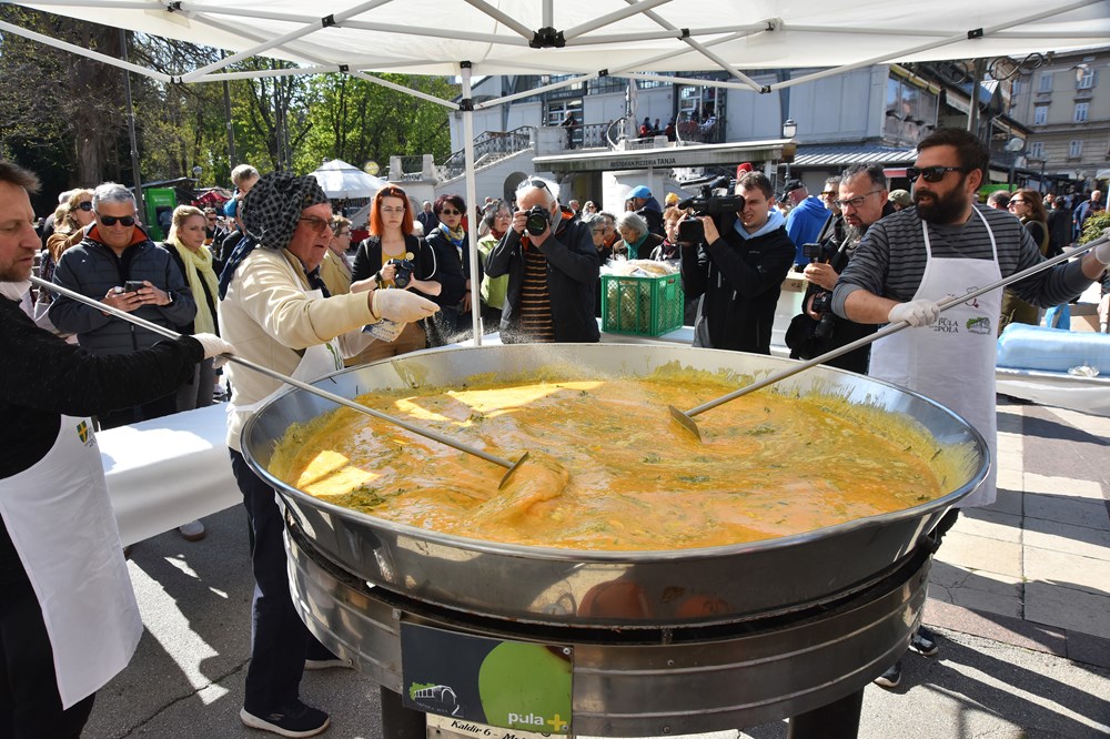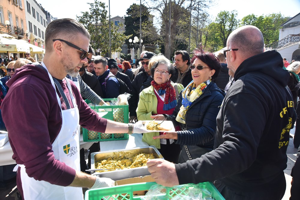 Kao i jutrošnji gosti tržnice, domaći i strani, i kuhari su bili vrlo dobro raspoloženi, a kako je program s pripremom hrane u velikoj padeli sam po sebi zanimljiv i atraktivan, već i sama priprema privukla je veći broj znatiželjnika, prije nego li je do podjele oko 600 porcija ove tradicionalne istarske delicije, uopće došlo.