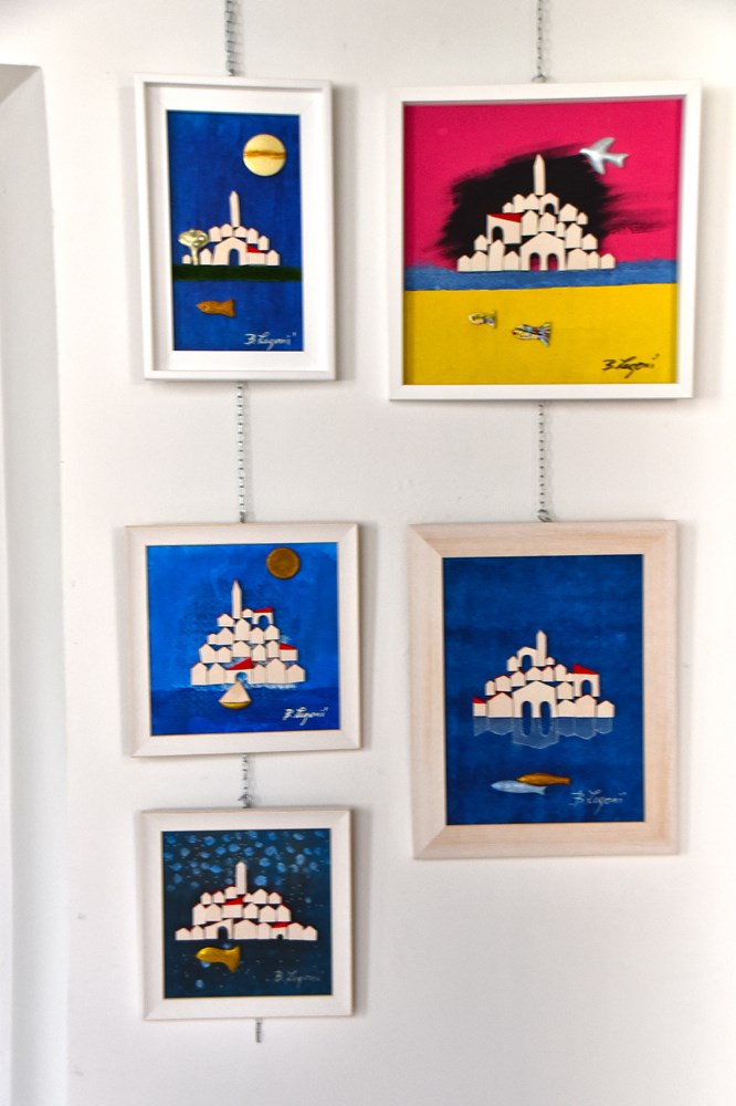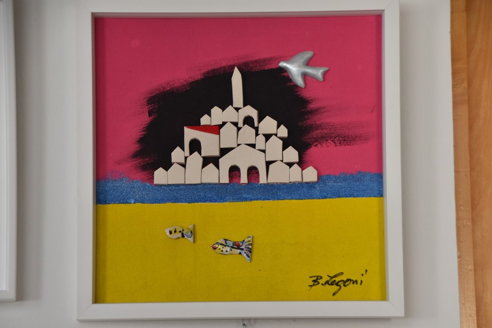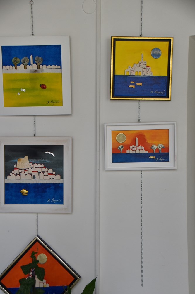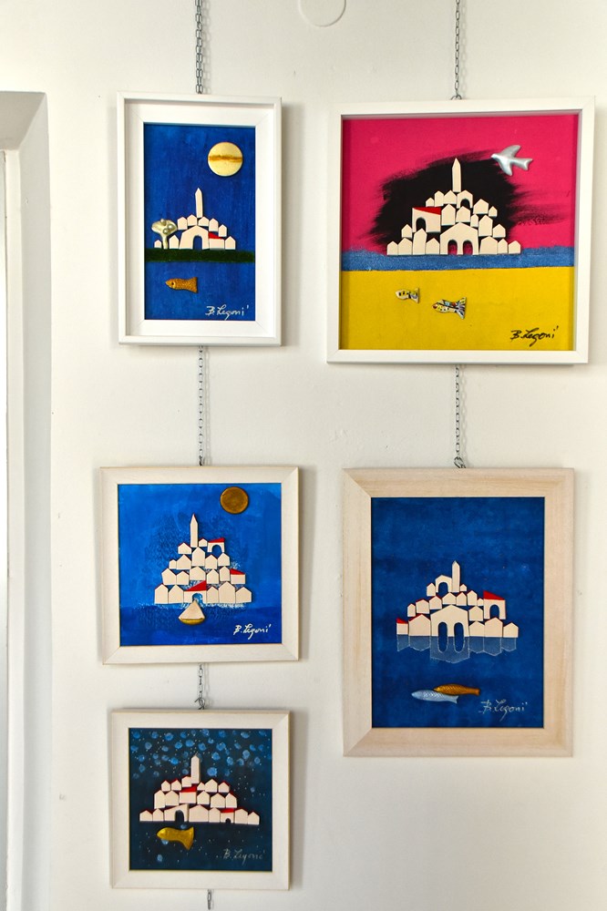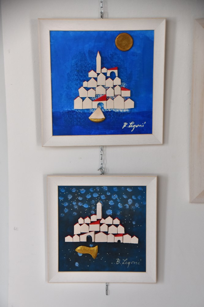 Mediteranski ambijent dočaravaju minimalističke i stilizirane 3D slike, bojane akrilom, na podlozi od sirovog lesonita s keramičkim detaljima - bijelim kućicama s crvenim krovovima, pokojom maslinom, galebom, barkom, ribicama. Boje su od jarkožute, preko narančaste, pink, tirkizne, plave, sve redom živahne, a svaka slika ima svoju atmosferu i svaka diše na svoj način. Lesonit je, kaže Legović, malo čudna podloga, ima strukturu tkanine i na njemu se može jako lijepo raditi.
