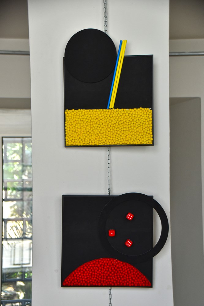 Sljedeću skupinu čine dva mala akrila na platnu, potpuno drukčije od onog što ta slikarska tehnika podrazumijeva i što smo navikli od Branke Legović. Rađene su s nizom neobičnih materijala, od stiropora preko silikonskih slamčica do šperploče. Drugačiji od svega ostalog na ovoj izložbi je veliki žuti akvarel, koji je zaslužio čitav zid za sebe. Riječ je o apstrakciji, što Branka rijetko radi, ali ovdje si je dala malo oduška. Kaže da 99 posto ljudi ne voli apstrakciju, čak ni stranci.