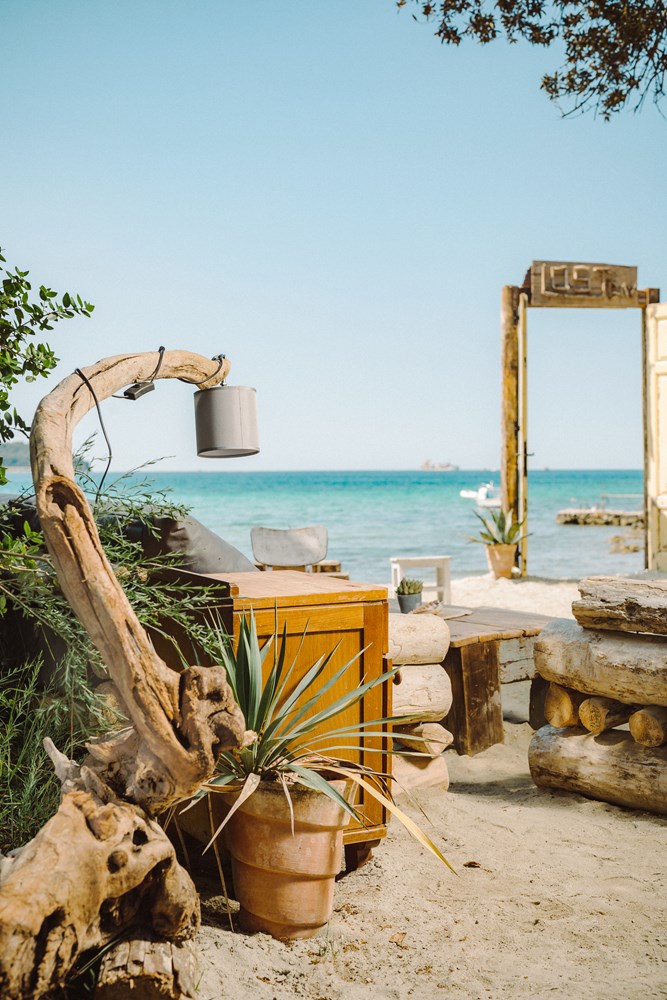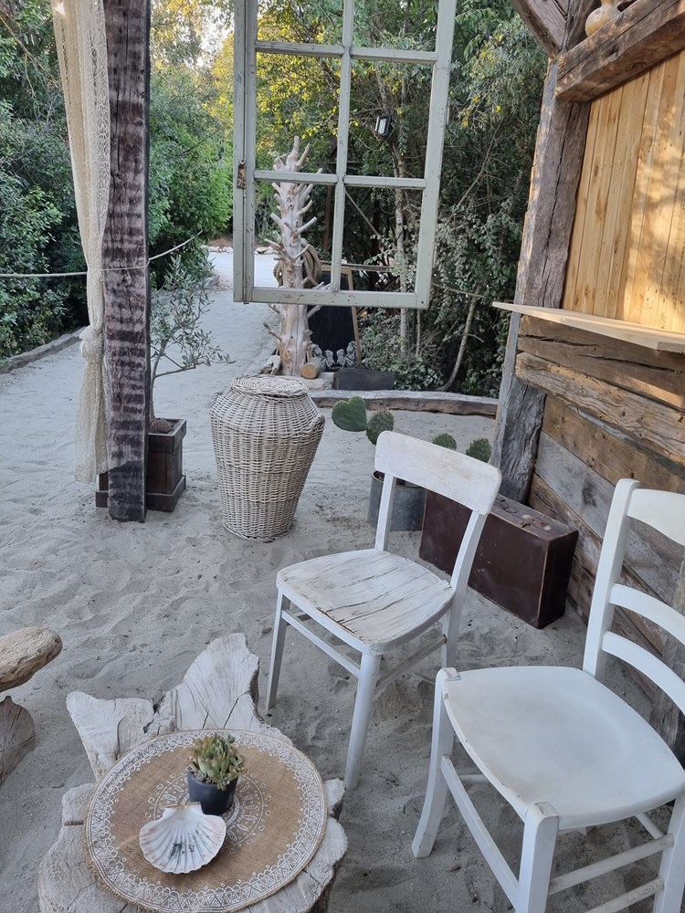 Ono po čemu je jedinstven ovaj ekološki beach bar pregršt je pomno osmišljenih detalja - od visećih drvenih okvira, lampica, školjki i simpatičnih natpisa, pa do minimalističkog namještaja, poput fotelja od naplavina, starih noćnih ormarića, kofera, koji podsjećaju na sajam antikviteta.