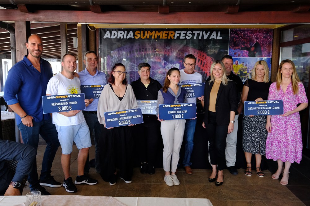 Nakon uspješna tri koncerta u Areni održana minulog ljeta, organizatori Adria Summer Festivala danas su uručili donacije u vrijednosti 20 tisuća eura sportskim, odgojnim i humanitarnim udrugama i organizacijama s Puljštine. Iznos donacija, koji je udvostručen u odnosu na prošlogodišnje izdanje, prikupljen je od prodaje ulaznica s koncerta Dina Merlina, Dubioze Kolektiva i Erosa Ramazzottija, a koji su održani od 11. do 13. kolovoza.