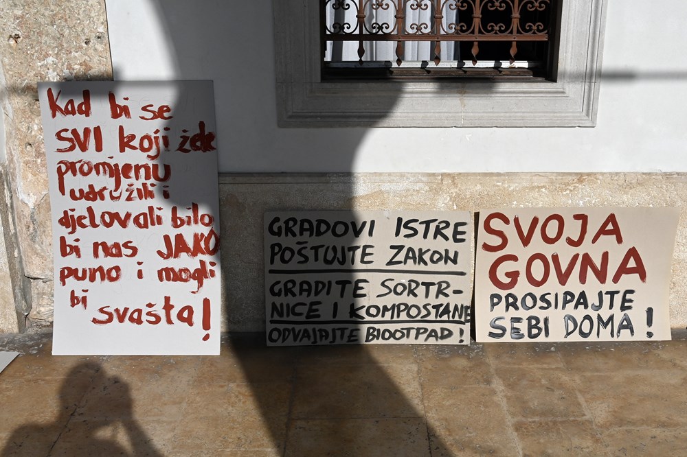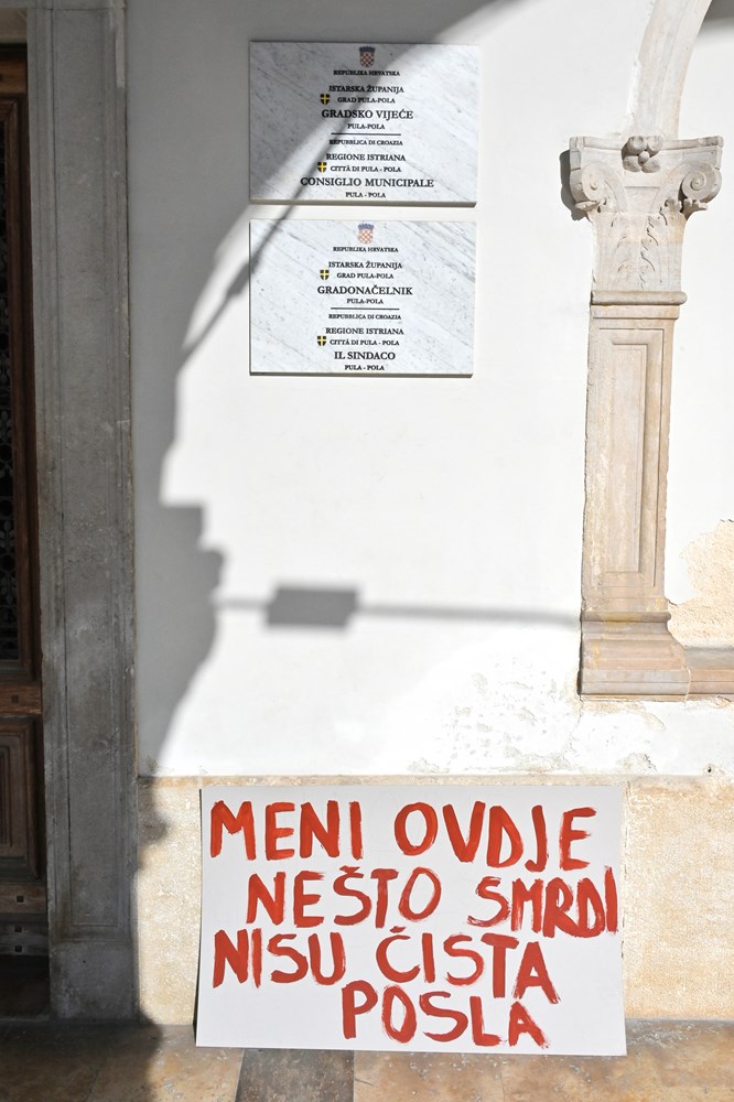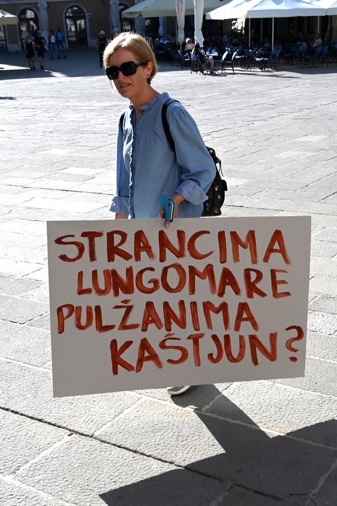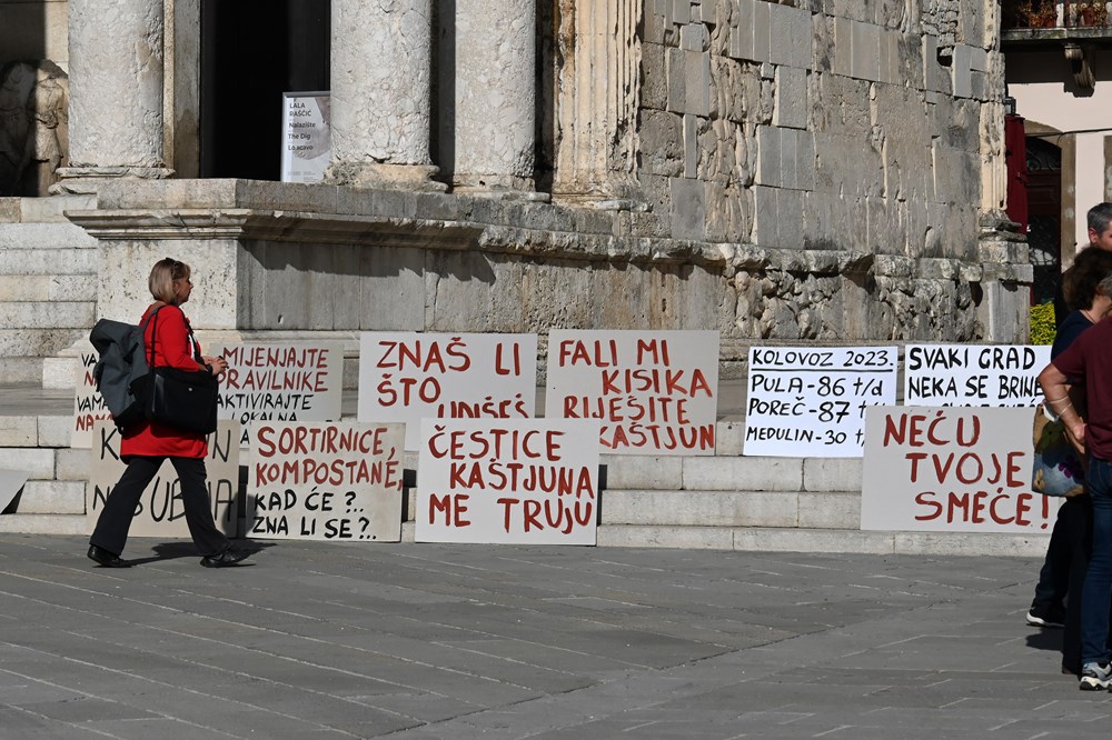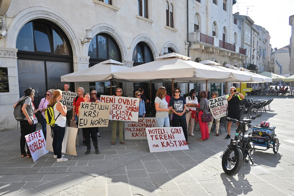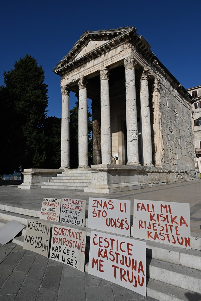 Ispred Foruma i Augustova hrama mogli su se vidjeti transparenti na kojima je pisalo: "Meni ovdje nešto smrdi, nisu čista posla", "Svoja govna prosipajte sebi doma!", "Znaš li što udišeš", "Kaštijun krši zakon!"... To su samo neke od poruka koje aktivisti kontinuirano ističu u nadi da će se riješiti dugogodišnji problem odlagališta Kaštijun, a je li to doprlo do onih koji imaju i nadležnosti da riješe ovaj gorući problem, moglo se čuti na sastanku koji je uslijedio u Gradskoj palači.