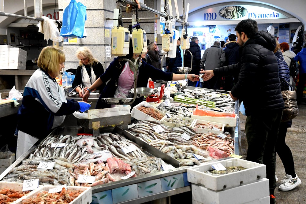 Ovih je dana ribarnica pomalo pusta, relativno je malo kupaca, pa prodavači s nestrpljenjem čekaju vikend, jer tad prodaja ribe ipak ide nešto bolje. Divlja orada je najskuplja, kilogram je čak 25 eura, ugor je po 8, lignjuni po 10, hobotnica doseže cijenu do 20, domaća lignja 22, oslić 12, kozice su po 15 i sipa po 13 eura.