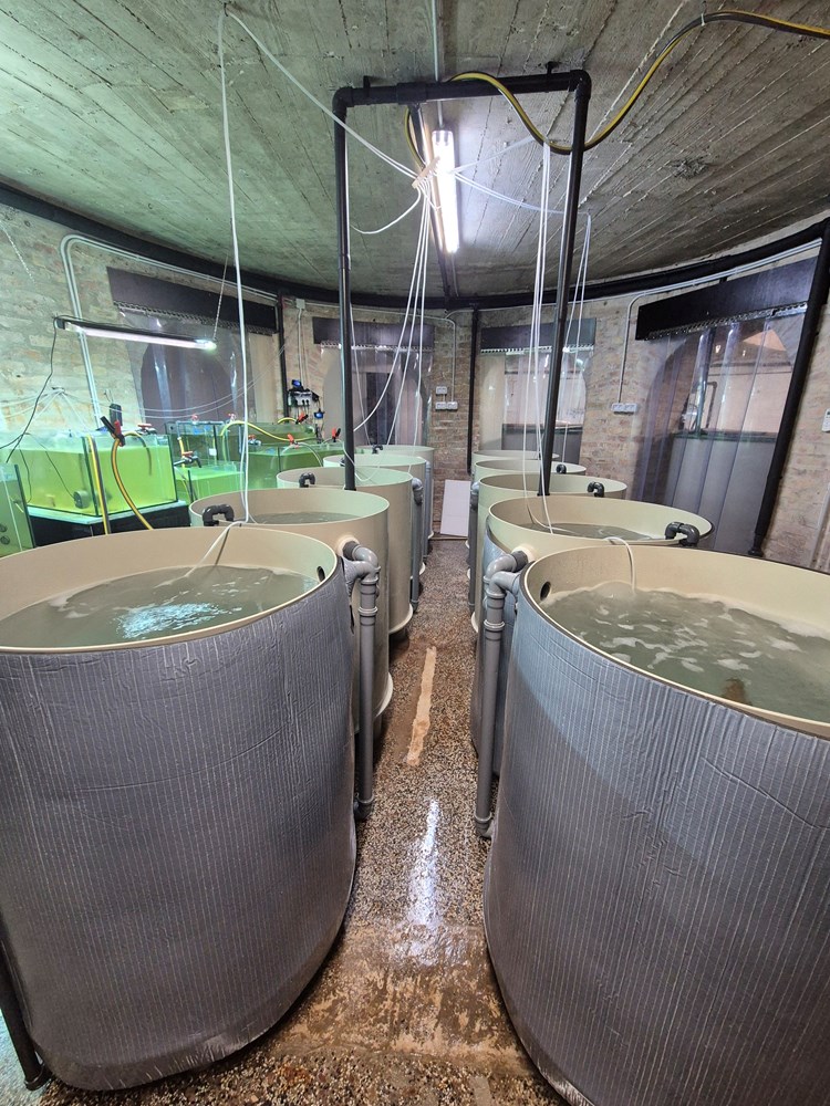 Pristigle jedinke su smještene u prihvatnim bazenima s morskom vodom koja je pročišćena i kontinuirano tretirana UV svjetlom te filtrirana na 1 mikrometar, a hrane se fitoplanktonom i zooplanktonom.