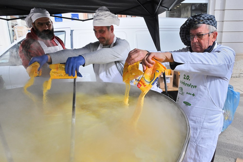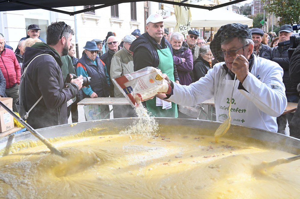 Petsto porcija težačke marende - palente kumpirice u kombinaciji s tek istaljenim slavonskim čvarcima, podijeljeno je jutros na pulskoj tržnici u sklopu tradicionalnog 21. Ucvirkenfesta. U dužim su redovima posjetitelji strpljivo čekali da Budimir Žižović Žižo i ekipa Rock caffea, uz pomoć braniteljske udruge Panonija i Pave Baotića, izmješaju ovo istarsko-slavonsko jelo i krenu s podjelom porcija. Budnim se okom pratilo što se sve dodaje u veliku padelu, komentirali sastojke i raspitivali li se među kuharima o prvoj pučkoj prerađevini od svinjskog mesa. Jutrošnja tradicionalna gastro manifestacija, 21. izdanja Ucvirkenfesta, organizirano je u suradnji Grada Pule i TZ Grada Pule, uz agenciju Avenue.