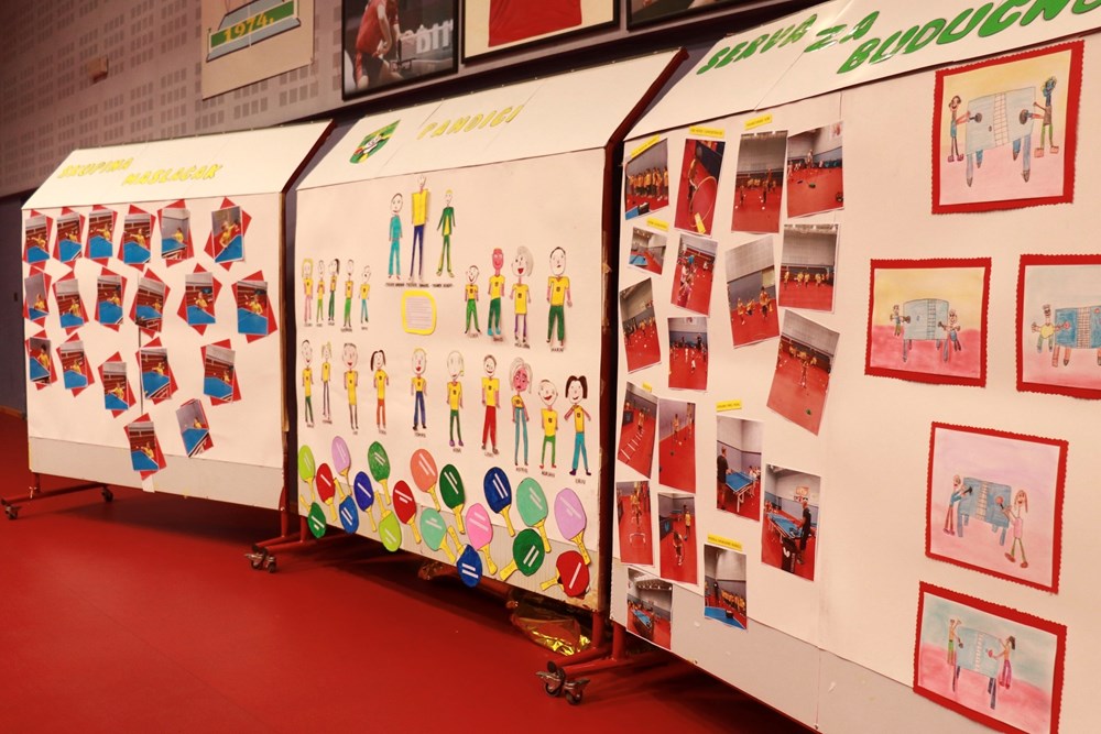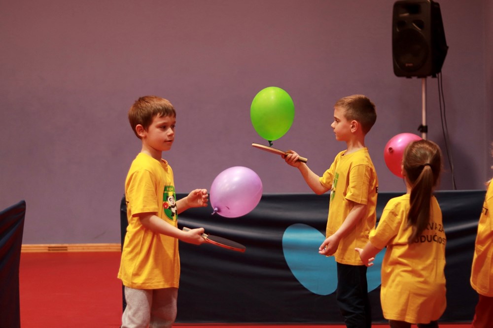 A nakon što su mališani pred publikom, uz pomoć odgojiteljica i trenera, odradili nekoliko vježbi - od balansiranja loptice, igranja stolnog tenisa do savladavanja poligona, uručeni su im diploma i reket u povodu uspješnog završetka projekta. Nisu zaboravili otpjevati svoju sportsku himnu, ali i roditeljima pokazati svoje likovne radove izložene na panoima.