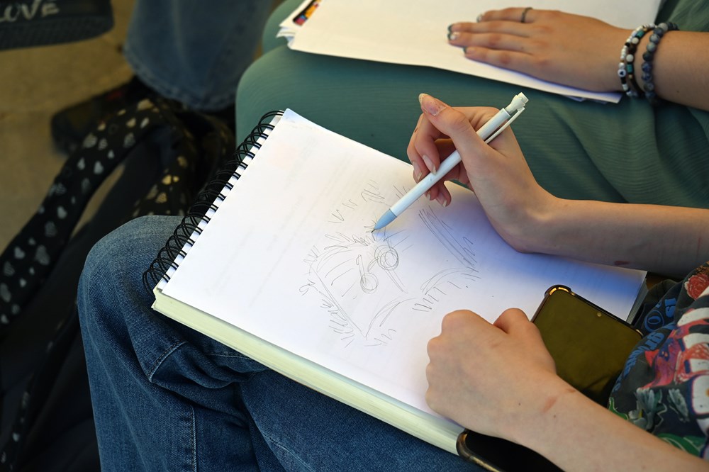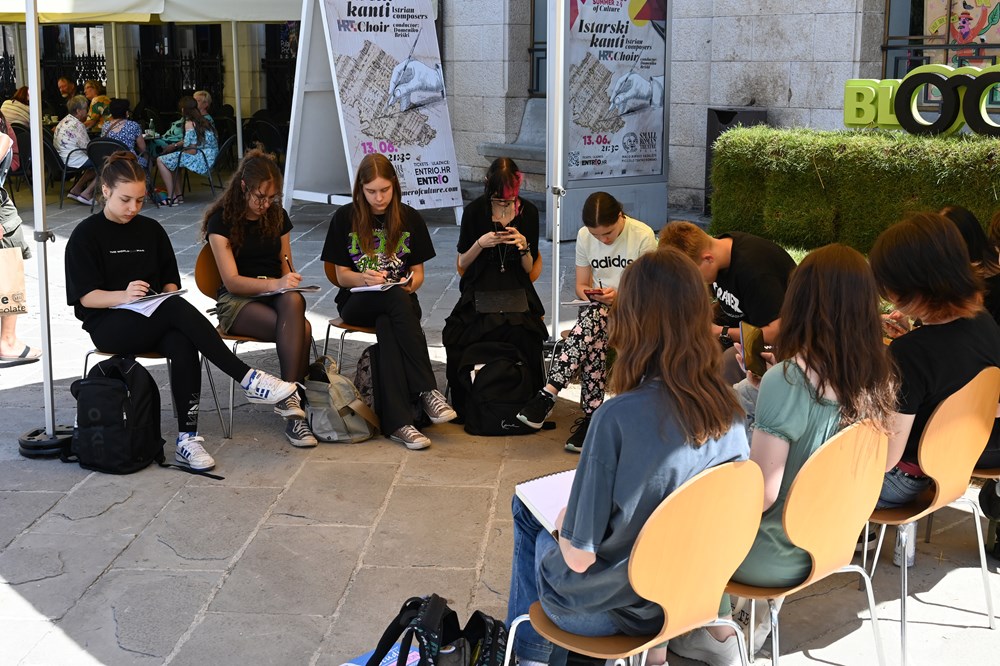 Otprilike istovremeno na Forumu, pored zelenog kauča ispred Turističke zajednice, učenici prvog razreda Škole primijenjene umjetnosti i dizajna pod vodstvom profesorice Suzane Kariko radili su slike u tehnici akvarela i olovke kroz koje su dali svoje viđenje Irske i Joycea. Taj dio programa nazvan je »Joyce u očima ŠPUD-a«, a kako izgleda to što su mladi pulski umjetnici napravili moći će se vidjeti na izložbi koja se otvara danas u 10 sati u TZ-u. Inače, zeleni će kauč napravljen od trave koji je realizirala Roberta Weissman Nagy nekoliko dana ukrašavati Forum, pa će posjetitelji na njemu moći i odmoriti i pročitati ulomak iz »Uliksa«.