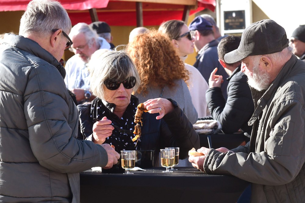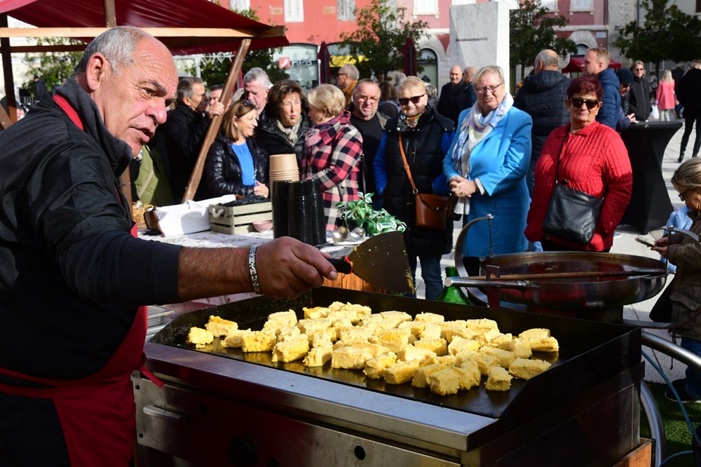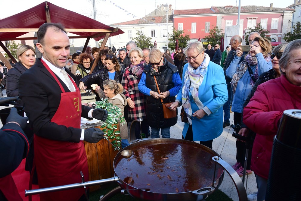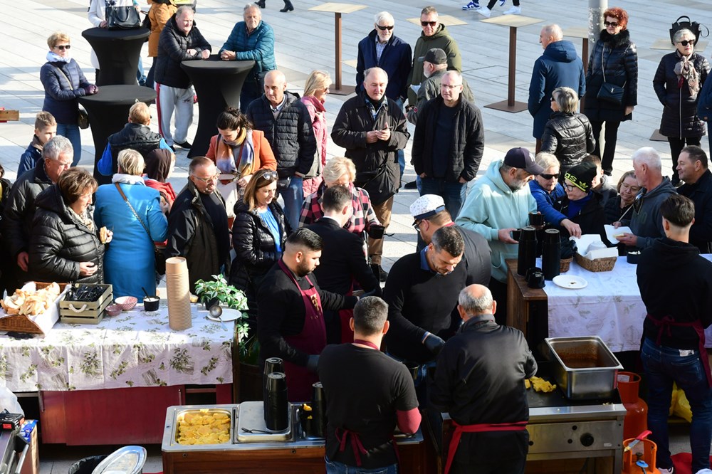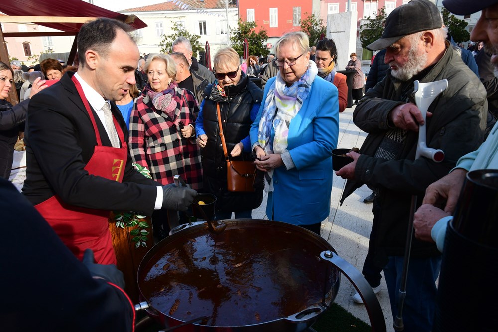 Svjetovni dio proslave blagdana nastavljen je na Trgu slobode podjelom besplatnih porcija palente s brodetom, koje je građanima dijelio i sam gradonačelnik Peršurić. Za zabavni dio programa, s obližnje pozornice, bili su zaduženi Baredinosauri i Anelidi.