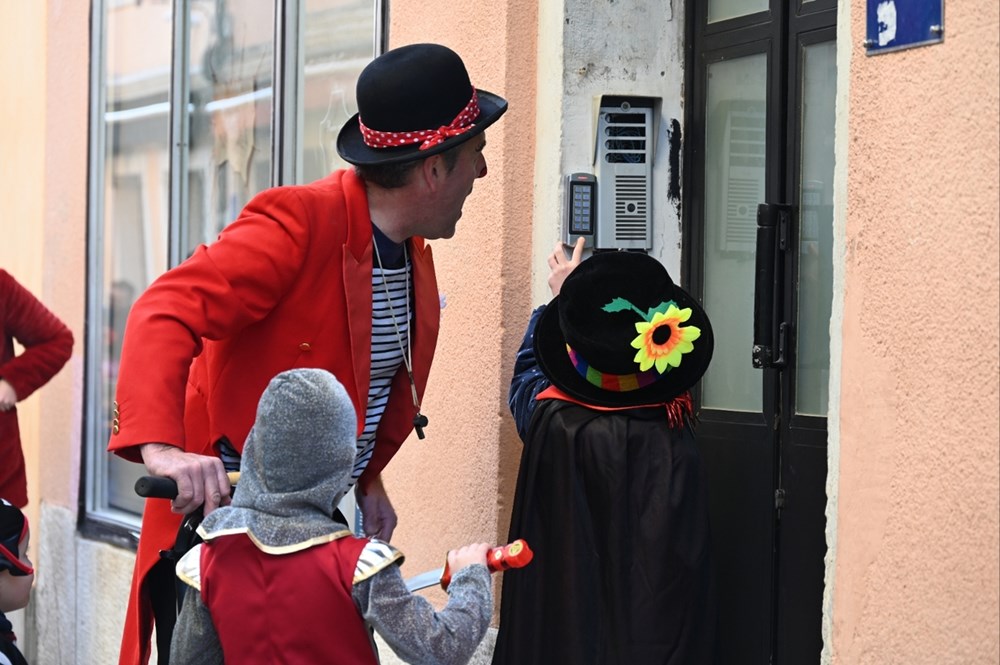 Karavana maškara, kojoj se pridruživalo sve više ljudi i djece, predvođena Marekom krenula je zatim putem Parka Grada Graza. U hodu nije izostalo ni dobrote ni dišpeta – kucalo se na vrata otvorenih radnji, zvonilo na parlafone i bježalo, nudilo pomoć nasmijanim dostavljačima.