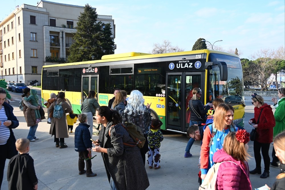 Već za prvu turu autobusa, koji je sveukupno odradio čak 5 tura, ispred pulskog Amfiteatra skupilo se mnoštvo maskirane djece i roditelja. Mogli su se tu vidjeti čarobnice, princeze, Štrumfeta, Spiderman i Superman. Pokušali smo izvući nekoliko riječi od malenog Tea, obučenog u Kapetana Ameriku kao i njegova majka, ali nam je pobjegao rekavši kako sada mora tražiti svoje prijatelje. Pričljiviji je bio Aven, prerušen u svog omiljenog čarobnjaka.