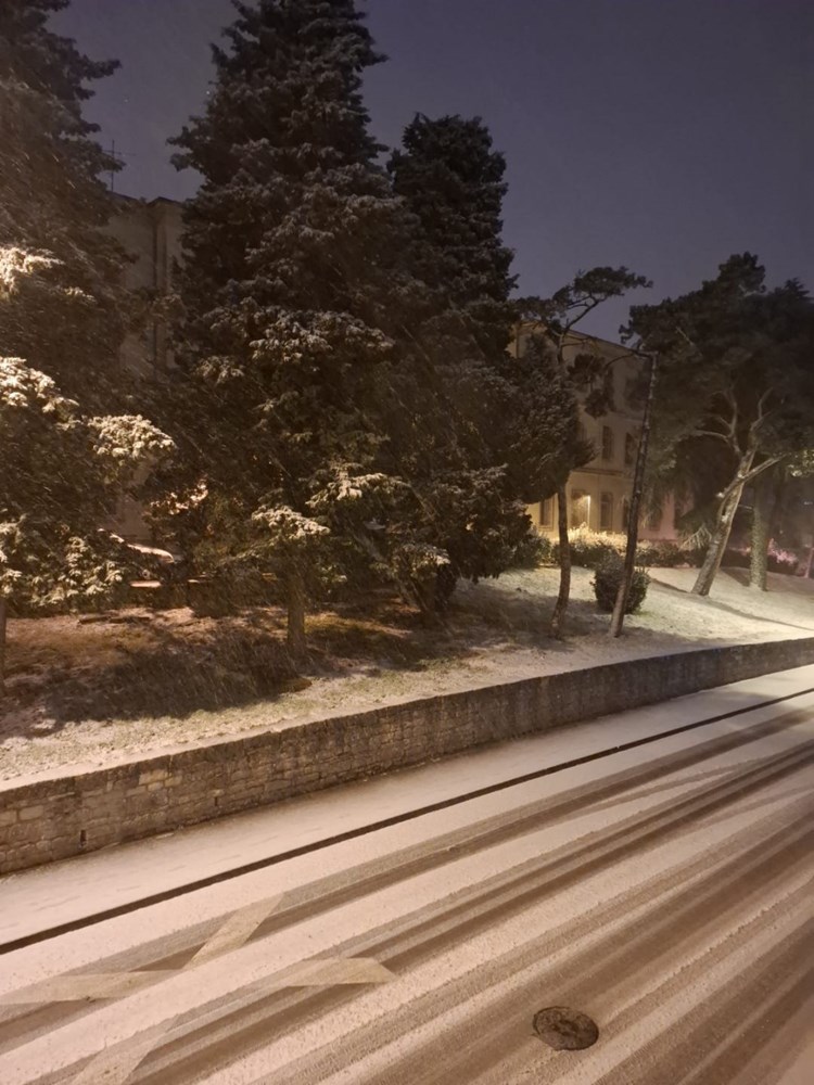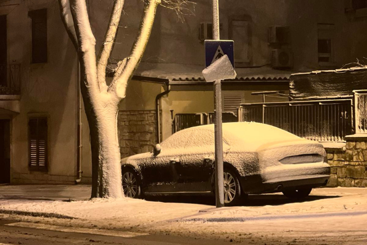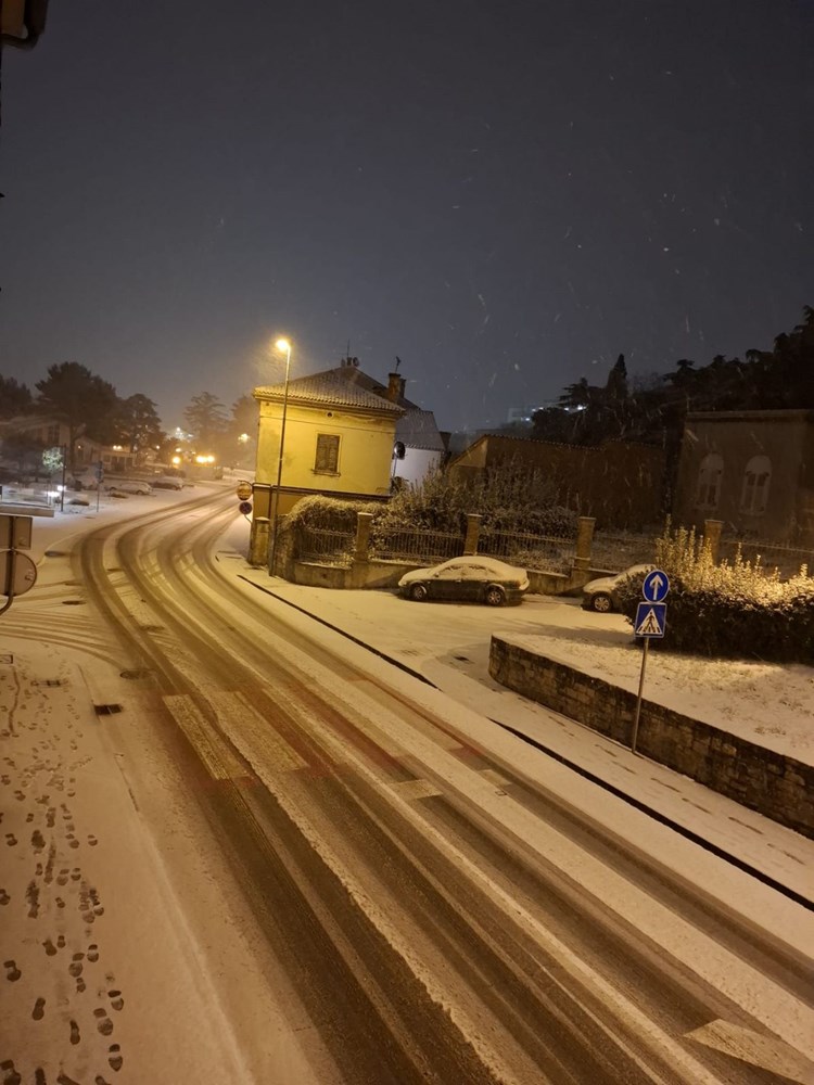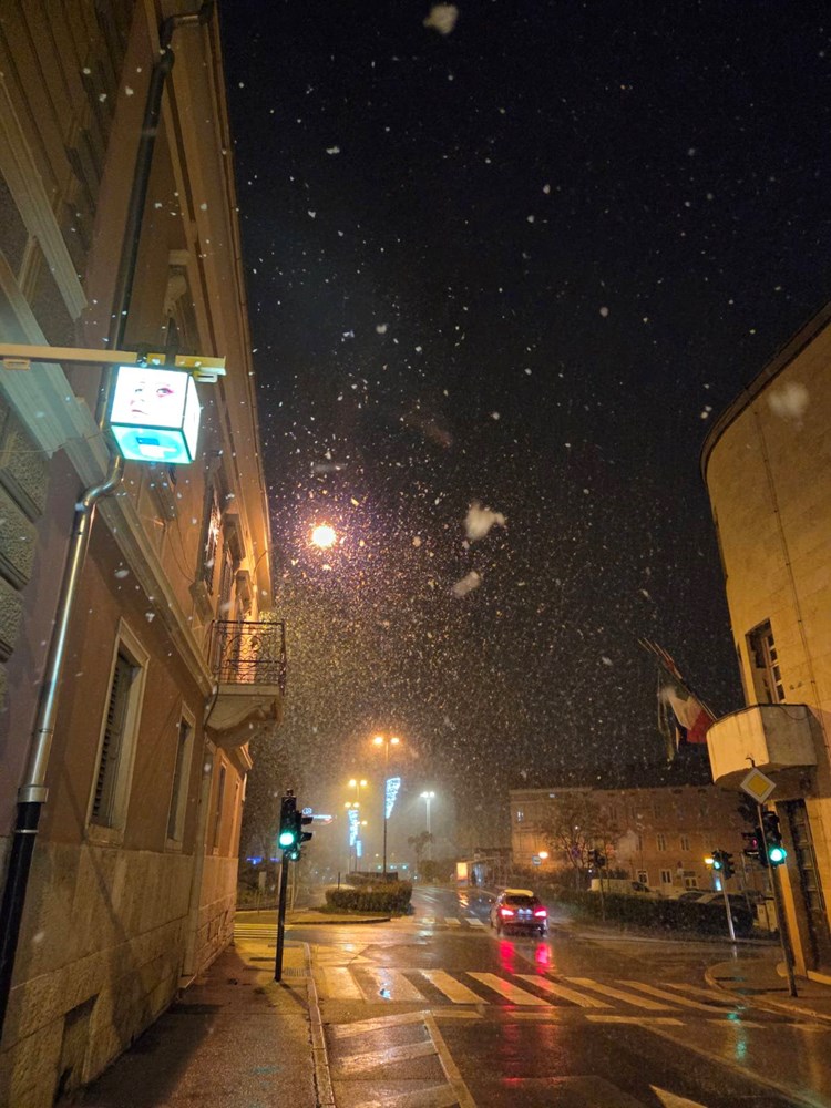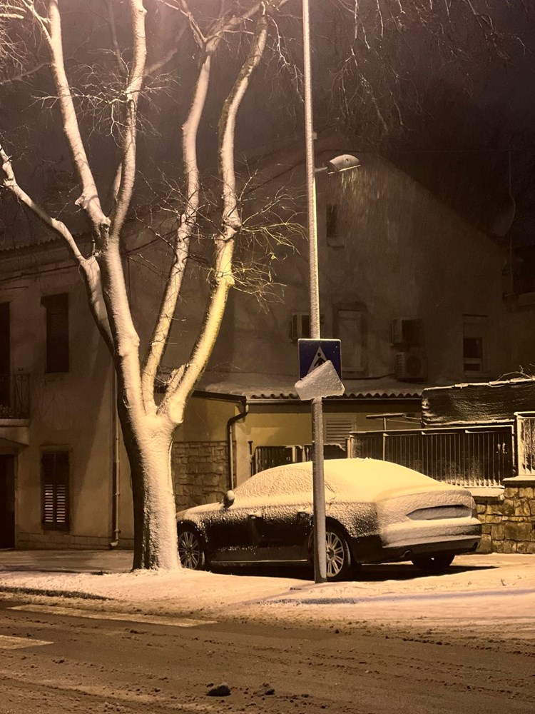 No, s padom mraka snijeg se ponovno pojačava. Temperature su u ovim trenucima oko nule, a snježne pahulje sve gušće zahvaćaju grad. Snijeg se zadržava na kolnicima, nogostupima i parkiranim vozilima, a dijelovi Pule postupno se ponovno zabjeljuju.