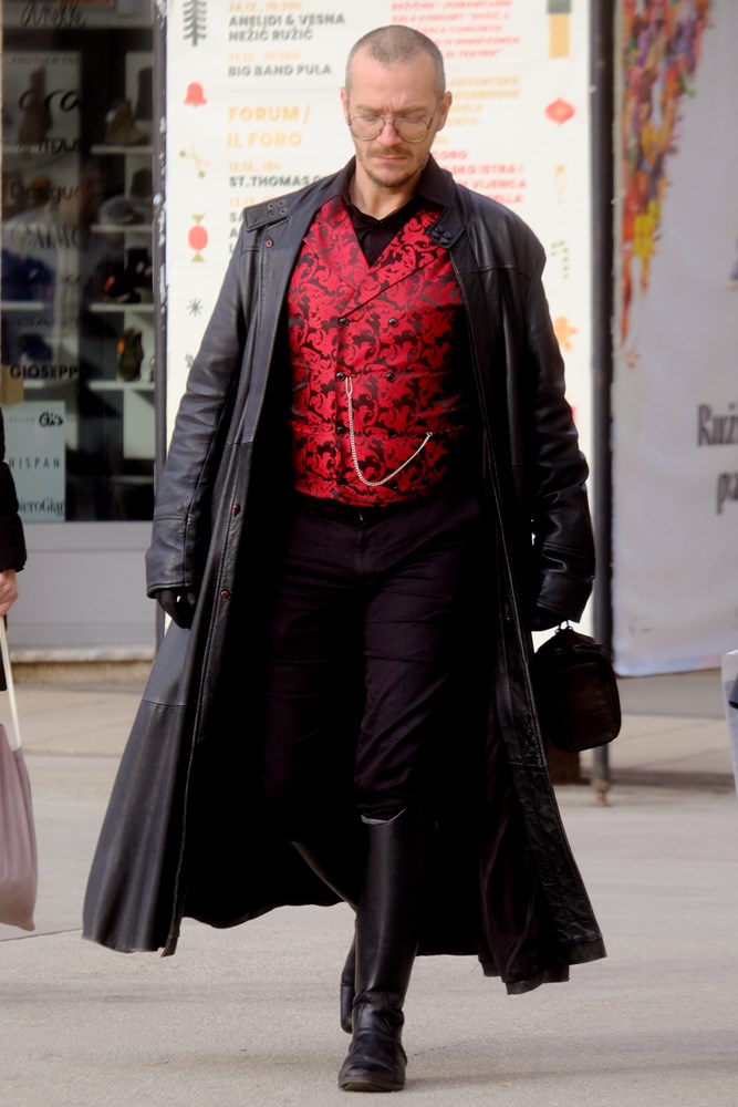 U centru grada naš je fotograf zabilježio zanimljiv modni trenutak - prolaznika u dugom crnom kožnom kaputu i crvenoj košulji s tamnim ornamentima, koja unosi izražen kontrast i vizualnu dinamiku u inače tamnu paletu.