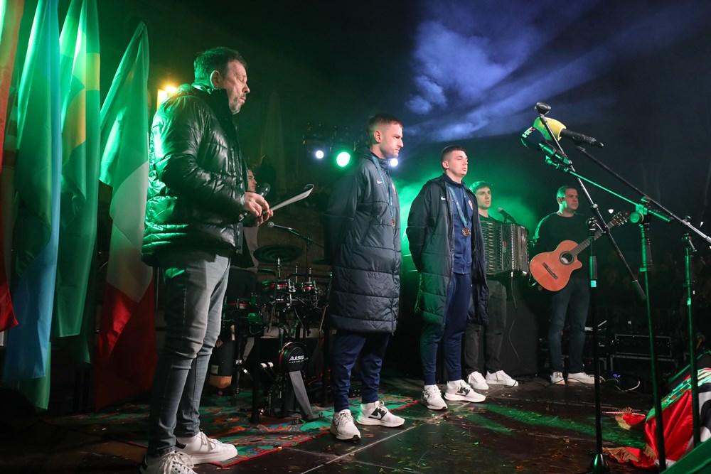 Kada su se Mataja i Vukmir pojavili na Portarati, okupljeni su ih popratili pljeskom i glasnim skandiranjem koje je, uz prskalice i pucanje konfeta, potrajalo nekoliko minuta. Ni mladi Puležani, koji su se iz Ljubljane vratili s broncom oko vrata, nisu skrivali emocije. Grlili su prijatelje, pozdravljali poznanike, a kasnije i strpljivo pozirali za fotografije, posebno s najmlađim fanovima koji su ih gledali s oduševljenjem. Dvojici sportaša čestitao je pulski gradonačelnik Peđa Grbin, naglasivši koliko je uspjeh reprezentativaca važan za grad i lokalnu sportsku zajednicu.
