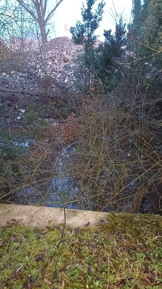 Na fotografijama se vidi zatrpano korito potoka, nanosi građevinskog materijala na više točaka, kao i voda koja se zadržava između zemlje i kamenja, bez jasnog prirodnog toka. Na pojedinim dijelovima vidljivi su i tragovi svježih radova, što upućuje na to da je do promjena došlo nedavno.