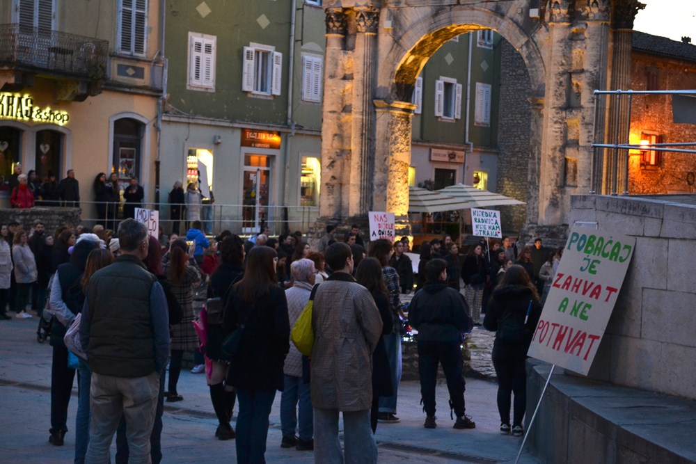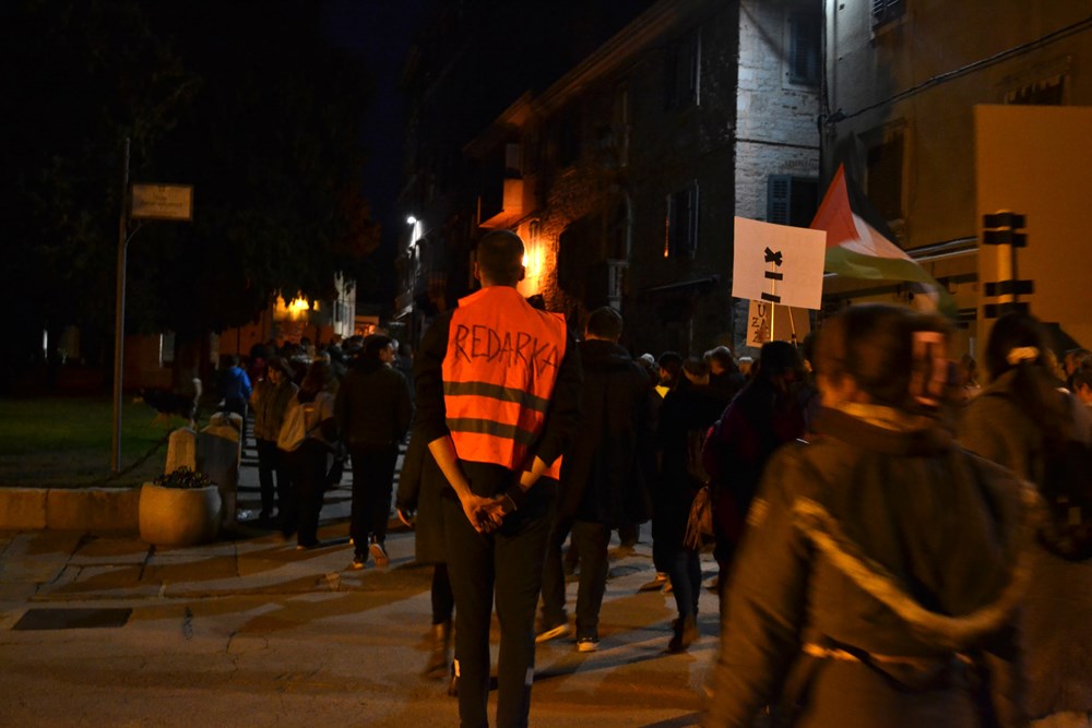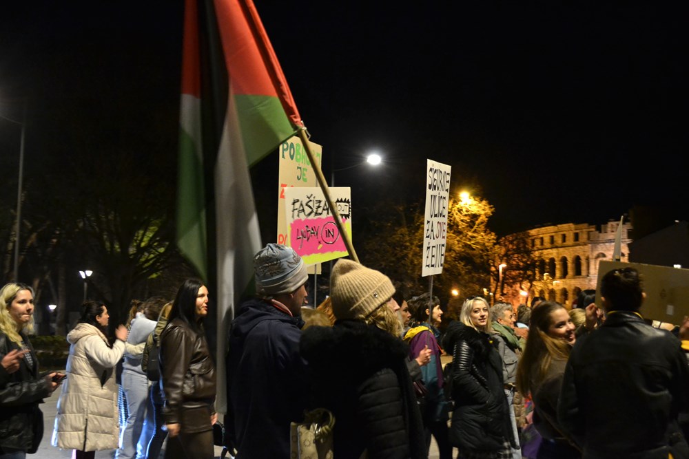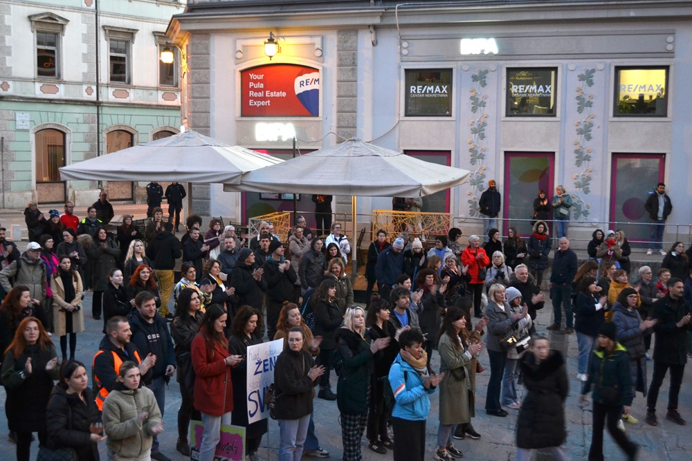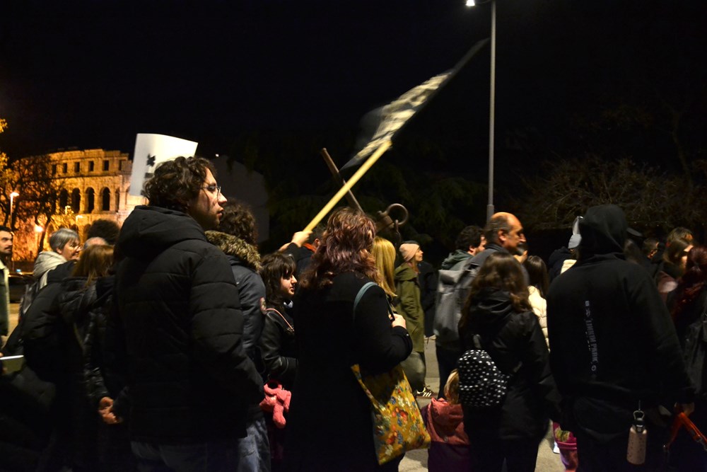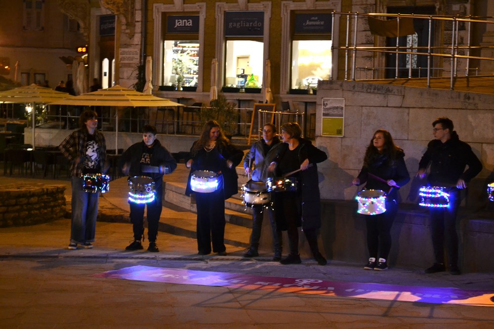 Sudionice i sudionici marširaju ulicama grada uz ritam i energiju bubnjarskog kolektiva Udarni pulski marš, u znak solidarnosti s noćnim marševima koji se održavaju u drugim gradovima diljem Hrvatske.