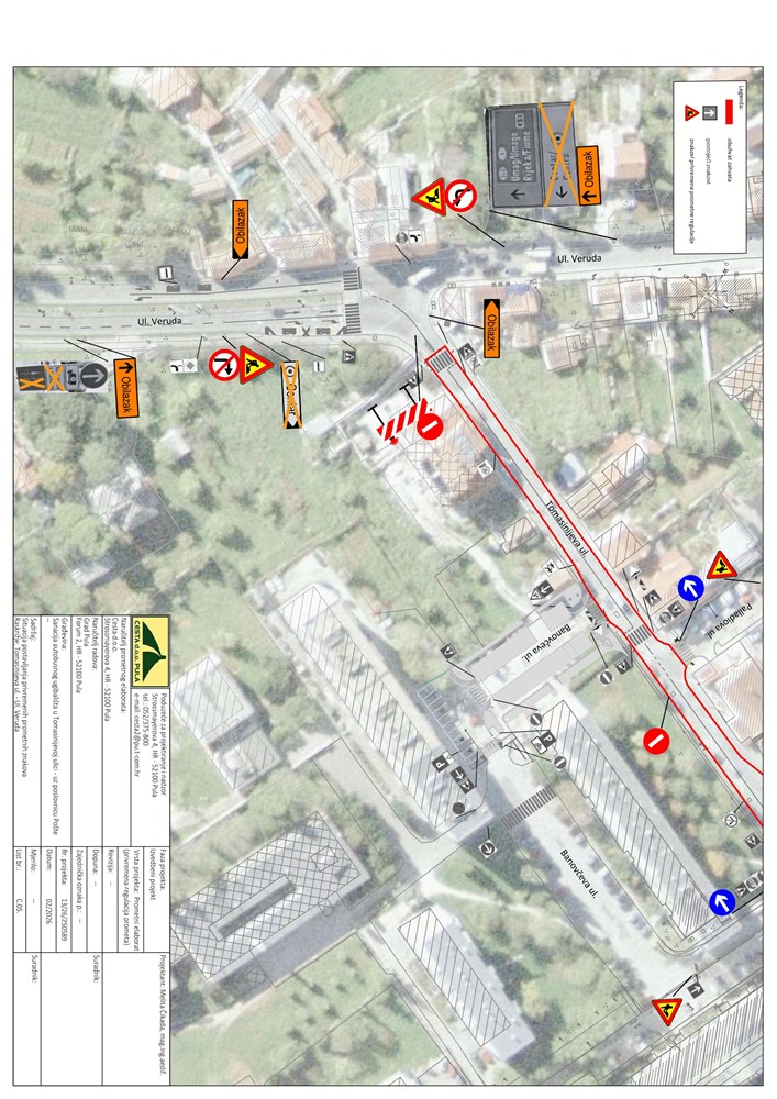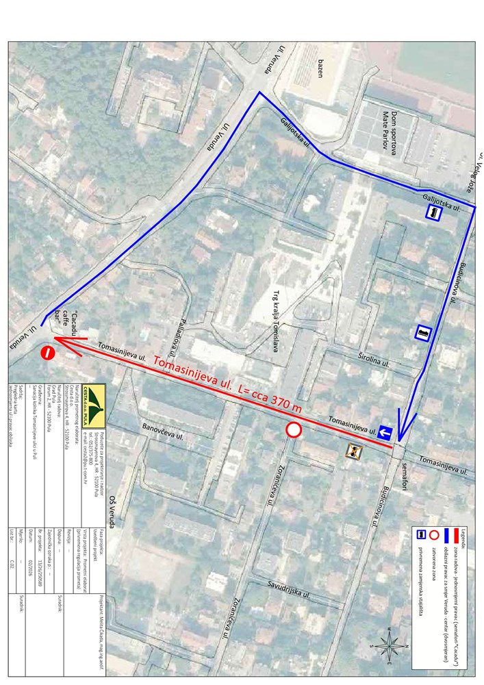 Tijekom radova na snazi će biti posebna regulacija prometa. Na dionici Tomasinijeve od Budicinove do Verude uvodi se jednosmjerni promet, dok će se obilazni pravac odvijati preko Ulice Veruda, Galijotske i Budicinove ulice. Privremeno se zatvara i izlaz, odnosno ulaz iz Tomasinijeve u Zoranićevu ulicu.