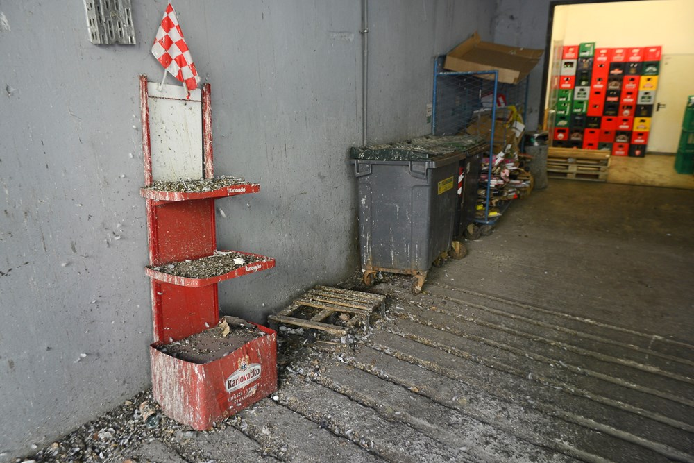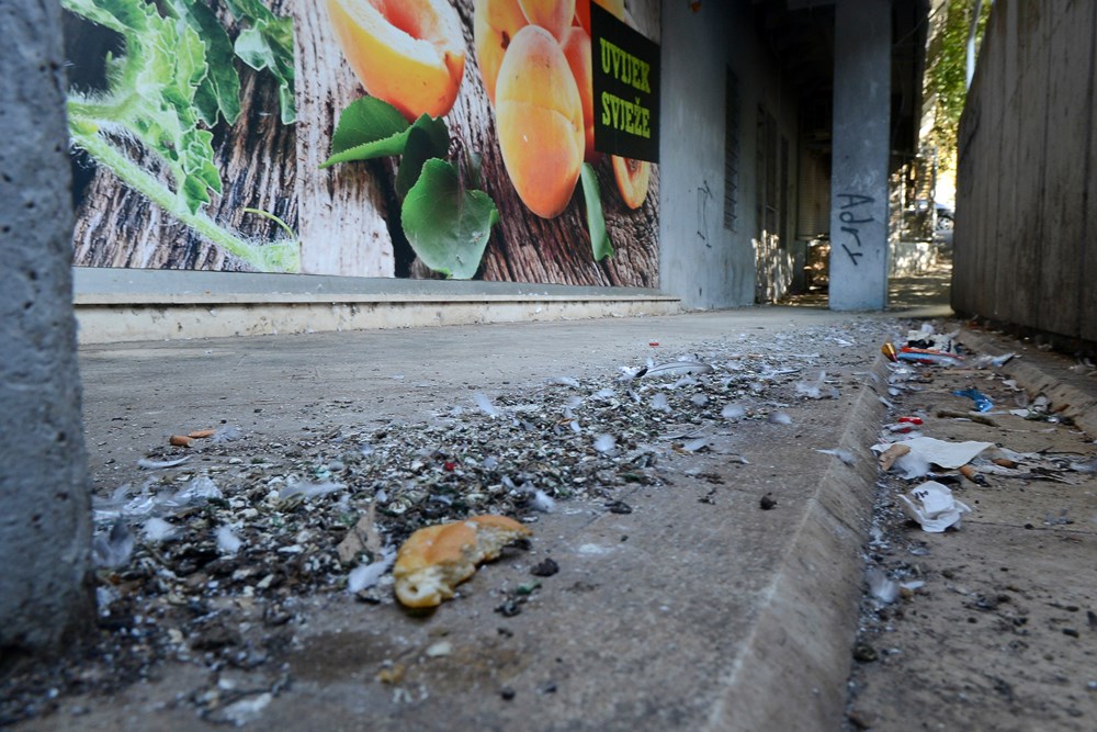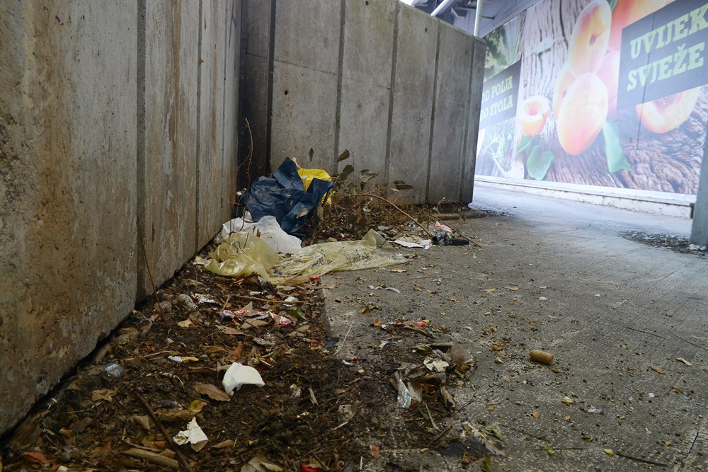 Crne slijepljene fleke po podu odaju da taj pod, vodu i četku nije vidio godinama, a stražu pred ulazom od ranog jutra "čuvaju" lokalni cugeri koji su si u ovaj ambijent dovezli fotelju iz koje je očito lakše pratiti kako prostor iz dana u dan postaje leglo zaraze. Da stvar bude gora, u neposrednoj blizini nalazi se i otvoreno skladište trgovine s pogledom na cestu, na čijem su ulazu također hrpe ptičjeg izmeta i prljavština koju očito nitko ne namjerava očistiti.