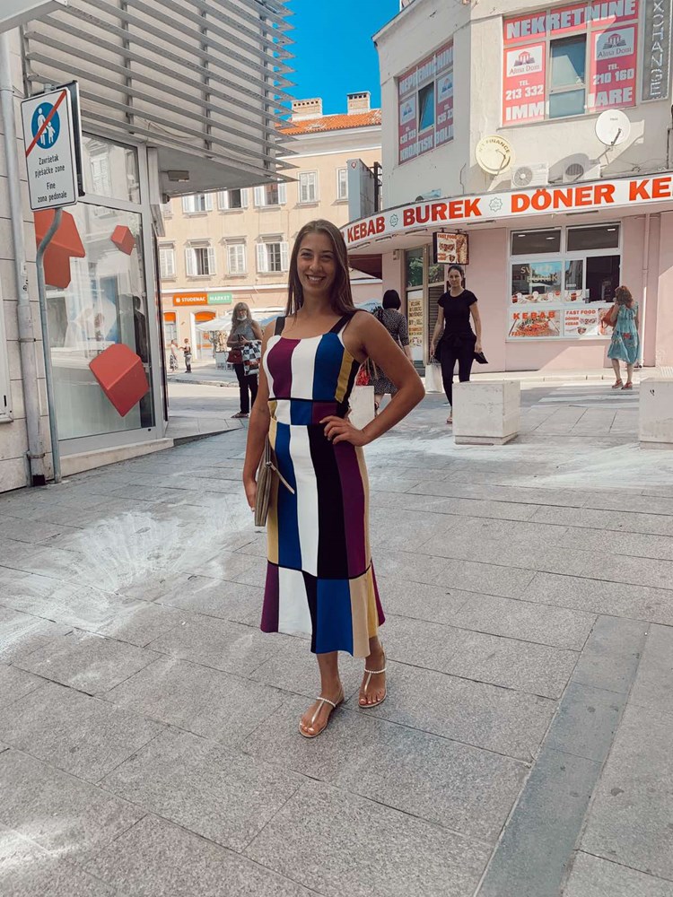 Imamo i jedinstvenu šarenu haljinu sa okomitim prugama. Kupljena je u Americi rekla nam je vlasnica.